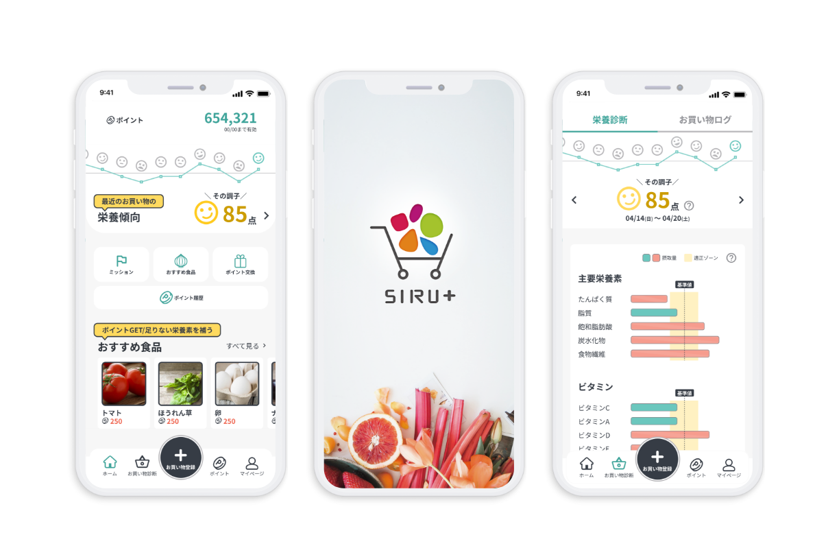 当社は、「食べたいものを食べて健康に」というビジョンのもと、ポイントも栄養もたまるヘルスケアアプリ「SIRU+(シルタス)」を2019年3月より提供しています。SIRU+は、スーパーマーケットなどの購買データを栄養分析することで、日々の買い物から栄養傾向を簡単に把握できるアプリです。また、2023年6月よりポイント機能を実装し、お得に健康を目指せるアプリとなっています。