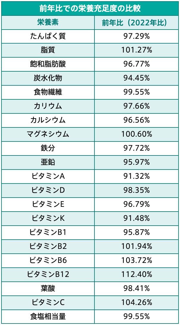 ・物価上昇により買い控えされた食品があったため、栄養素の充足度にも影響が出ていました。具体的には、ビタミンA、ビタミンK、炭水化物、亜鉛、カルシウム、ビタミンE、飽和脂肪酸の充足度が低下していました。