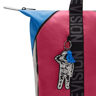 ポップカルチャーとストリートスタイルをミックスしたKipling x MTVコレクションのバッグに、お馴染みのMTVロゴを極端に強調したグラフィックデザインで配置し、大胆なカラーブロッキングでアイキャッチなデザインに仕上げています。裏地にはリサイクルナイロン100%の素材を採用し、地球環境にも配慮したサステナブルな商品です。アクセントとなるチャームは、キプリングのアイコンであるロボットモンキーと共に、MTVビデオミュージックアワードで受賞者に授与されるトロフィーの宇宙飛行士モチーフ「ムーンパーソン」が付属しており独特の存在感を放っています。