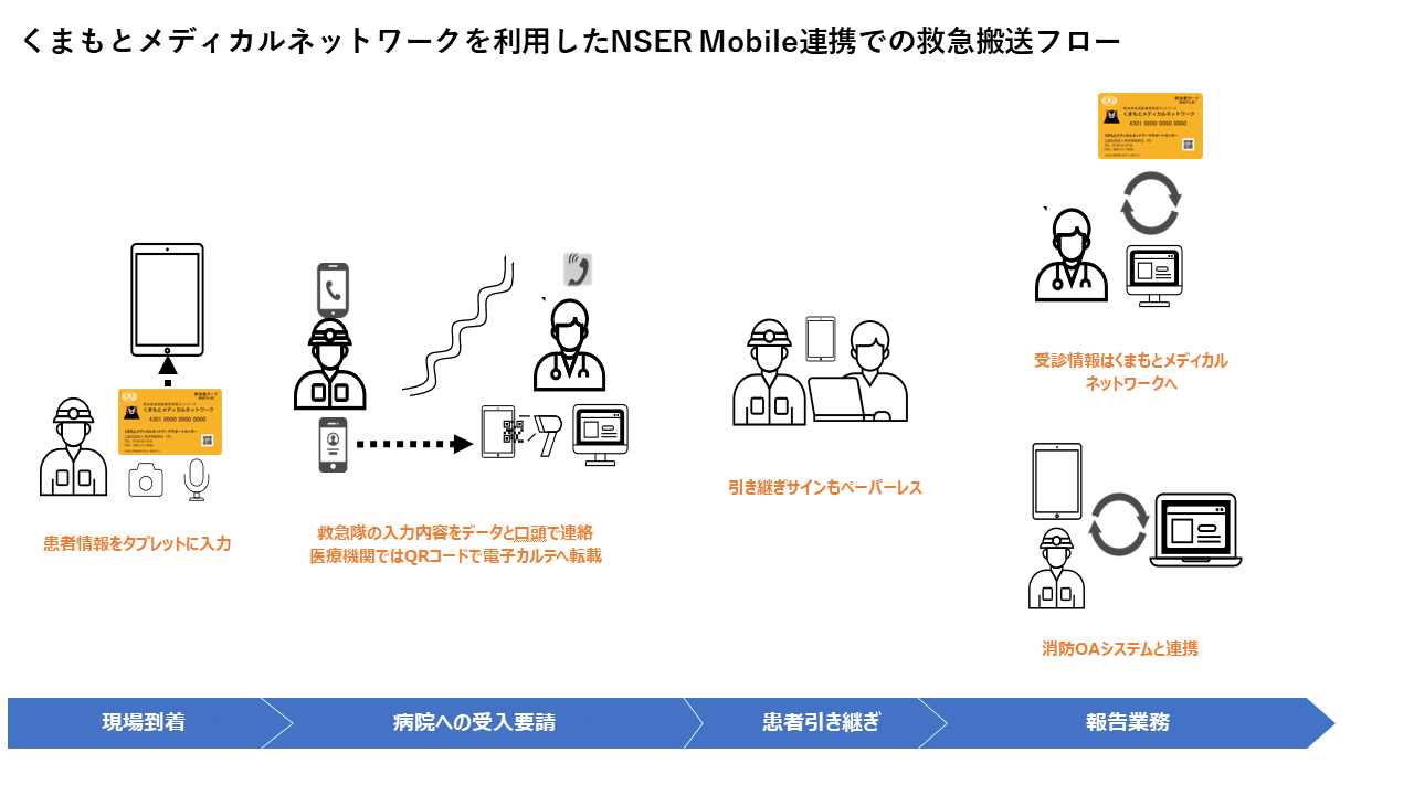 今回の実証試験では、救急搬送支援システムNSER mobileと「くまもとメディカルネットワーク」が連携いたします。