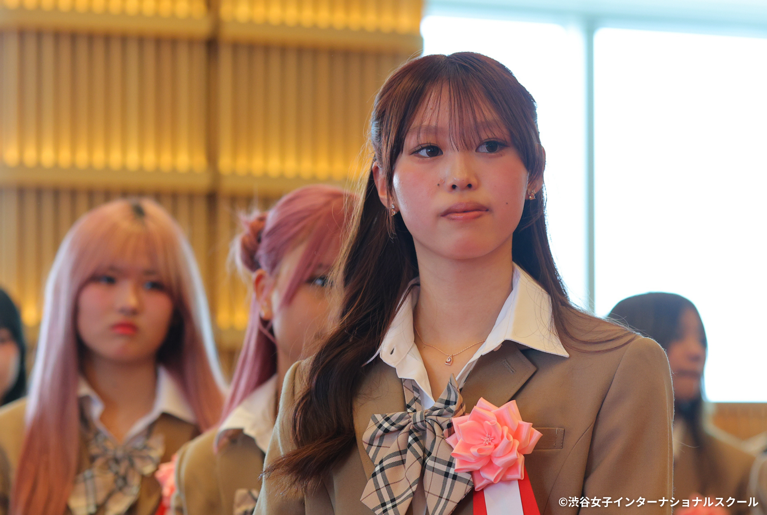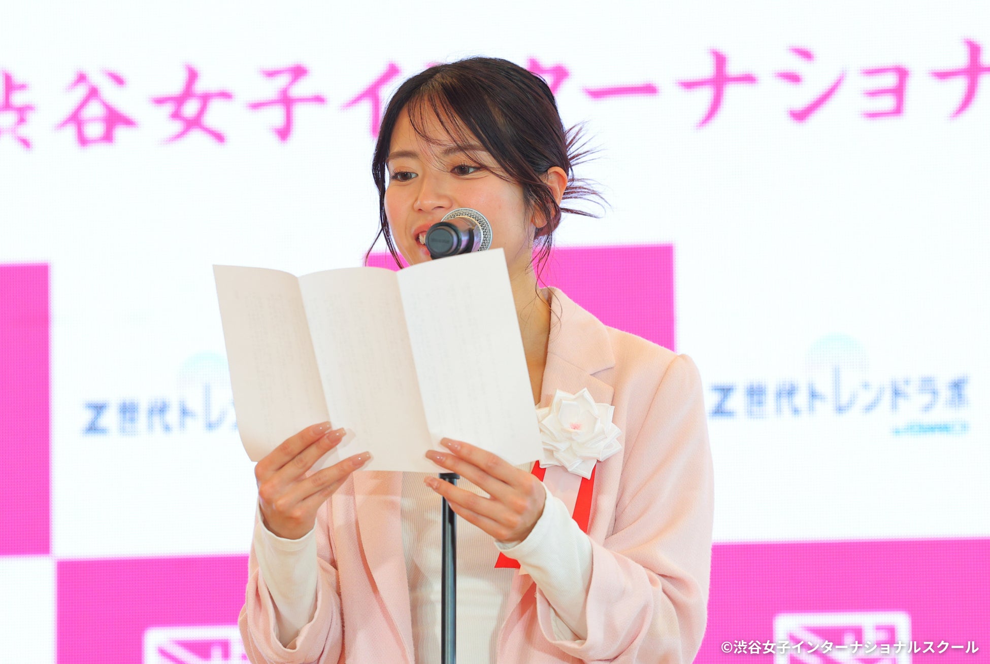 来賓を代表して、一般社団法人 渋谷区観光協会 代表理事の金山淳吾氏より祝辞が贈られた後、在校生代表として第3期生の野崎珠愛さん、長嶺紗和さん、佐藤芹菜さんの3名が登壇。先輩としての経験を交えながら、新入生に向けた歓迎の言葉を届けました。