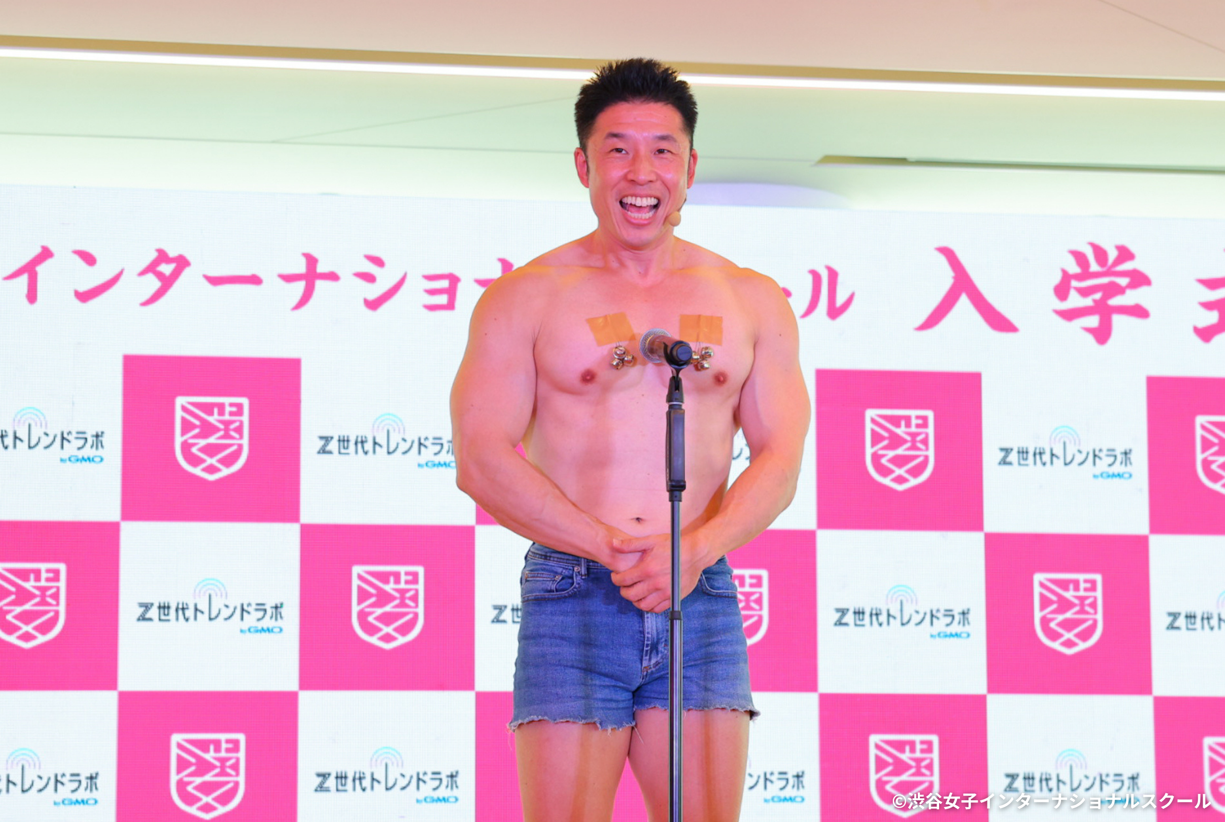 スペシャルゲストとして登壇したのは、お笑い芸人・ボディビルダーのなかやまきんに君。「渋谷から世界へ」「自分の人生は自分が決める」をテーマに、自身のLA留学経験を交えた熱いメッセージで新入生の背中を押しました。
