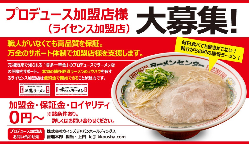 加盟店募集において、『加盟金・保証金・ロイヤリティ 0円〜(諸条件有り)』とし、ラーメン事業に取り組みたい方々が開業を実現しやすいパッケージとしております。店舗では職人に頼らずクオリティの高い商品提供が可能です。これは、麺やスープなどの食材を、自社グループ内の工場で熟練した職人の手により、一括生産することでコスト削減を行いながら、店舗では職人に頼らず一定の商品品質を保つことができます。また、創業より「博多一幸舎」がこれまで培った経験をもとに厨房設計、機器、各種備品などについても、顧客満足はもとより、従業員の利便性や経営効率など幅広い視点でのアドバイスを提供いたします。