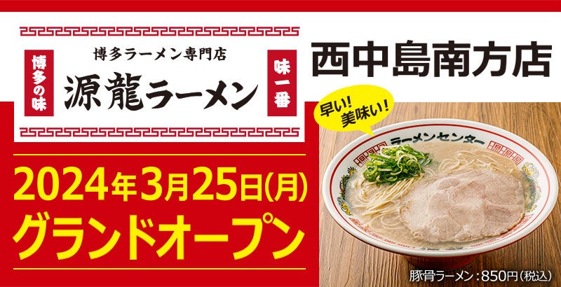 【元祖泡系博多一幸舎】プロデュース博多ラーメン専門店「源龍ラーメン(げんりゅう)西中島南方店」が2024年3月25日(月)グランドオープン!