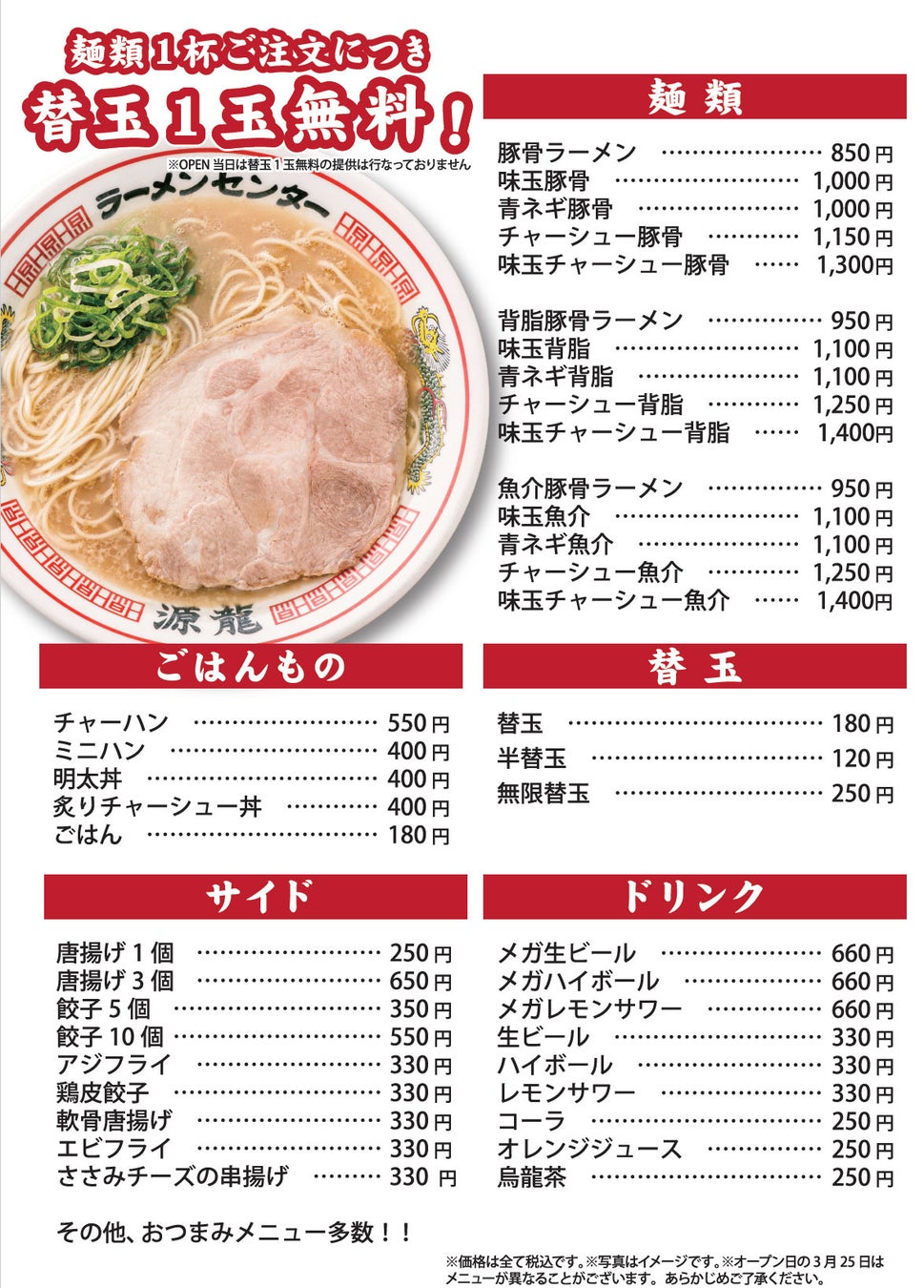 ※3月25日(月)オープン日は替玉1玉無料の提供は行っておりません。