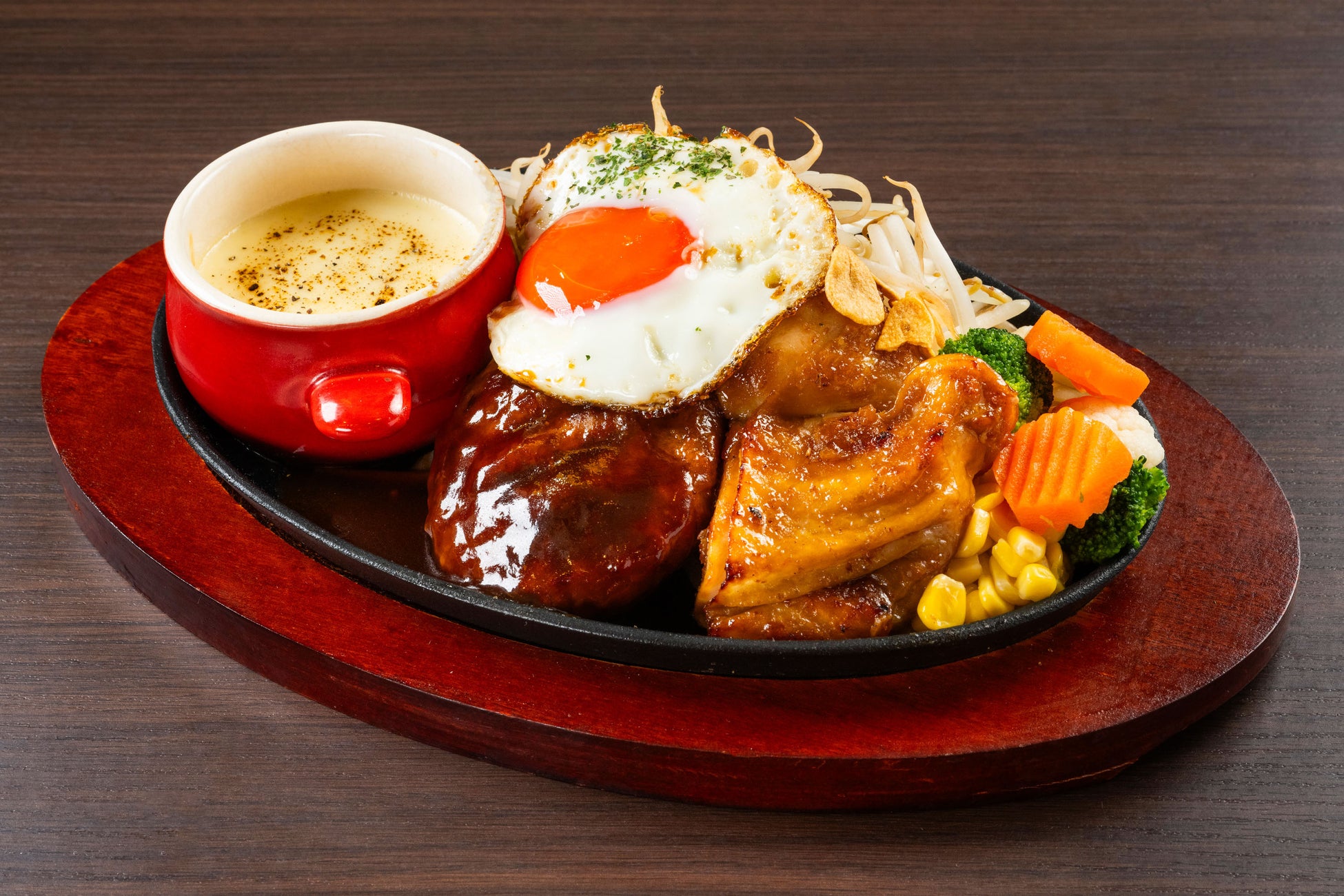 肉汁たっぷりのオールビーフハンバーグとジューシーな大山鶏のチキンステーキを一皿で。とろけるチーズ&半熟目玉焼きでボリューム・満足感ともにMAX!