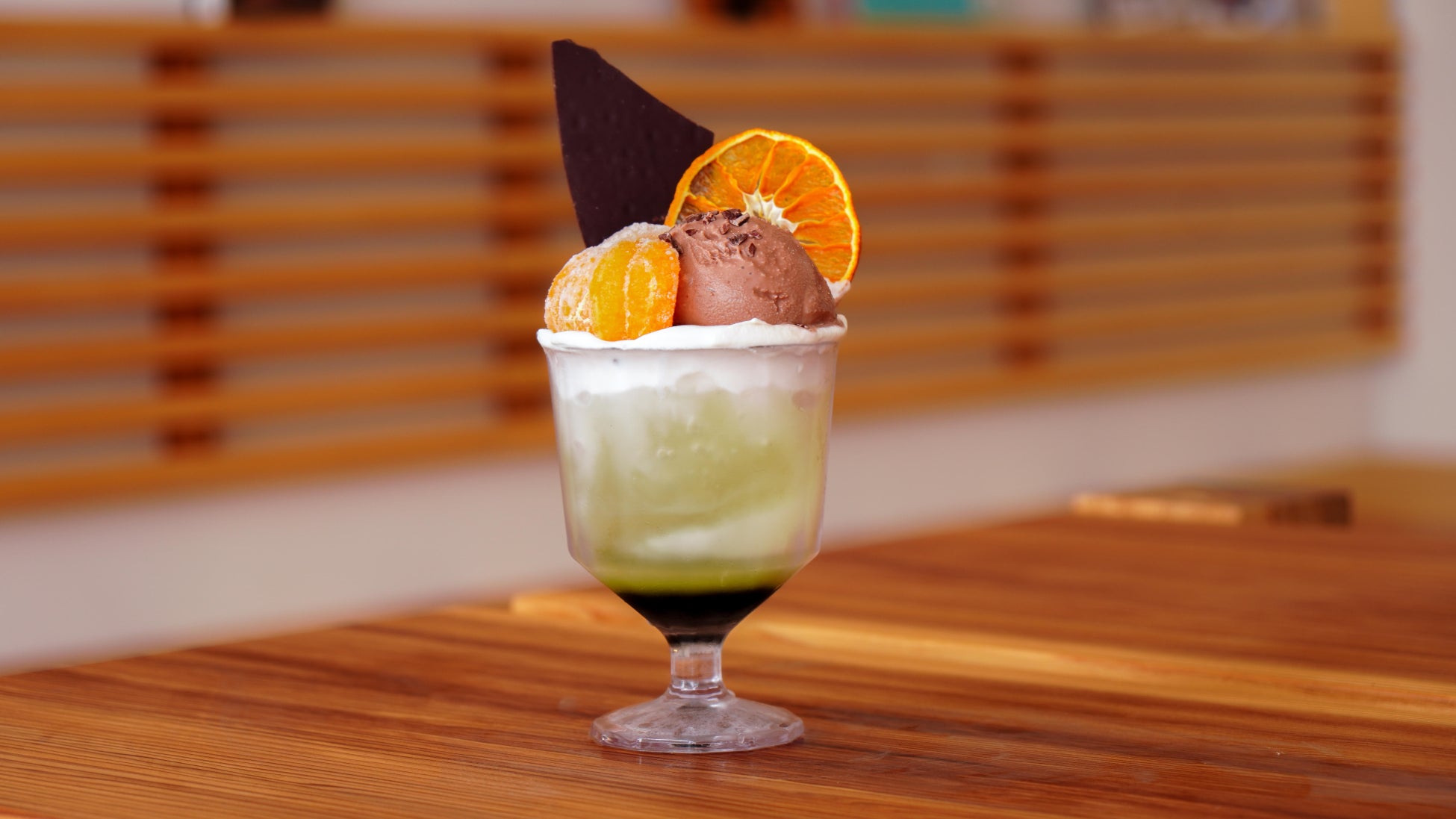 本山茶と自慢のチョコアイスを使った煎茶を味わう氷パフェ。