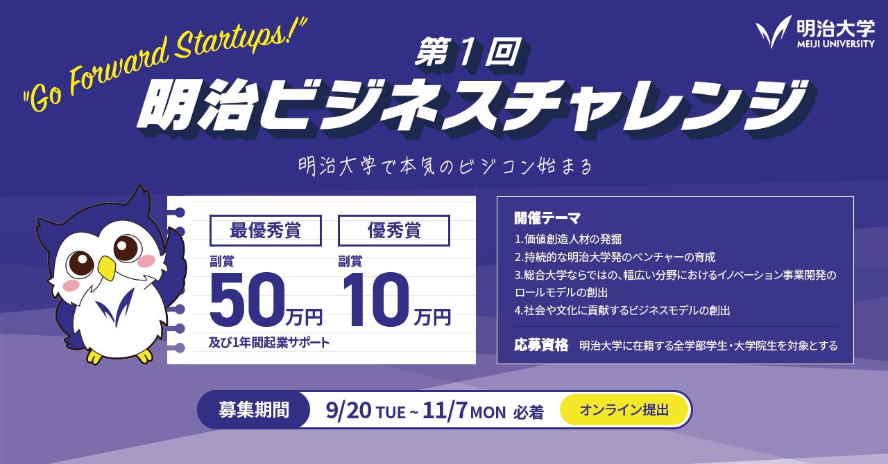 明治大学経営学部では、そうした明大生が「前へ!」挑戦し、明日の社会に向けて動き出す機会を提供することを目的に、今年度の秋学期にビジネスコンテストを開催します。