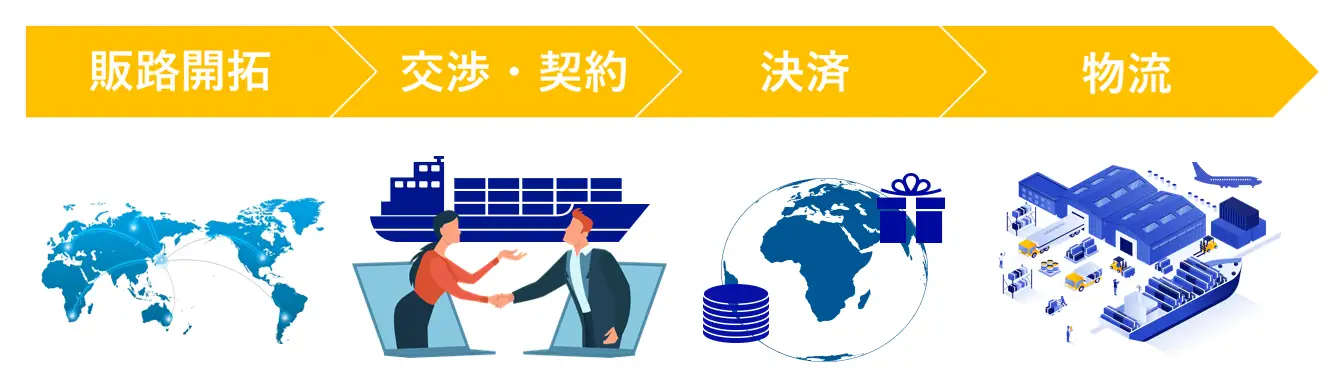 一方、中小企業ではそもそも貿易人材を自社で抱えることは現実的でなく、取引規模も小さいことから商社への委託も困難です。こうした課題を抱える中小企業には貿易まるなげパッケージ「デジトラッド」を活用いただくことで、人員面・コスト面ともに、無理のない輸出参入を実現しています。