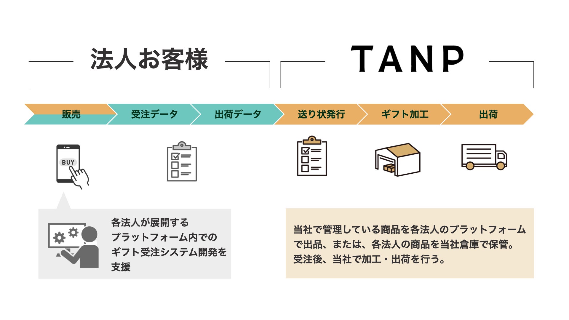 タンプでは、ギフトEC事業を展開する中で、ギフト特有のニーズに応えるため、複雑なシステム開発や倉庫オペレーションの構築を行ってきました。そのノウハウは、ギフトニーズに応えたいというメーカーや小売業者の方から評価をいただいており、システムの提供や当社倉庫からの梱包・発送を行う3PL事業として展開しています。