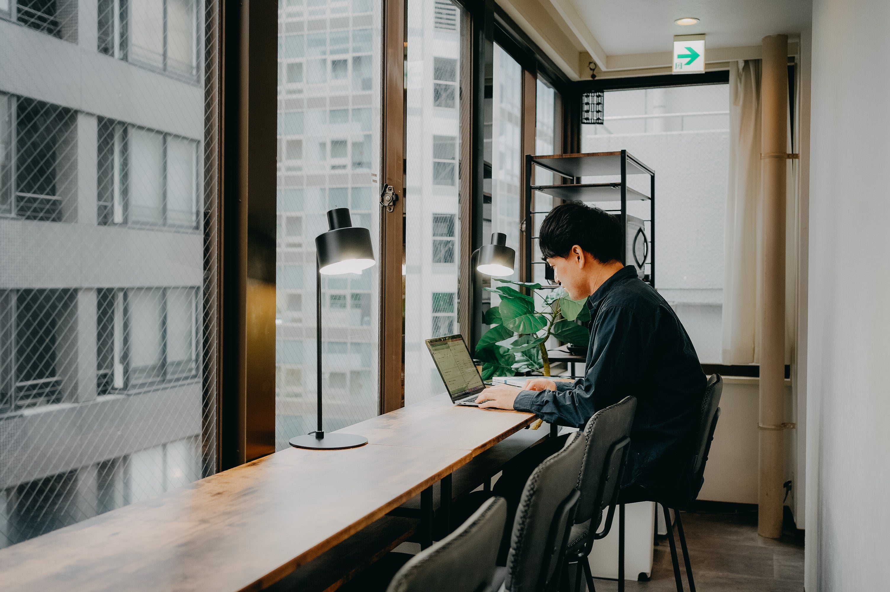 新橋の雑居ビルに隠れ家のように佇むゲストハウス。一部リノベーションも実施し、コンパクトながらグリーン溢れる居心地のいい空間に仕上げました。カフェのようなカウンターデスク/チェアなどのワークスペースも完備され、ビジネス利用にも便利。