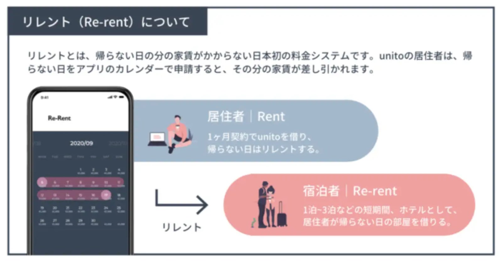 本物件の特徴である「リレント機能」は、入居者が外泊時に自分の部屋をホテルとして貸し出すことにより家賃が外泊数に応じて減額するシステムで、入居者は浮いた家賃でほかの場所での居住・宿泊が可能になります。