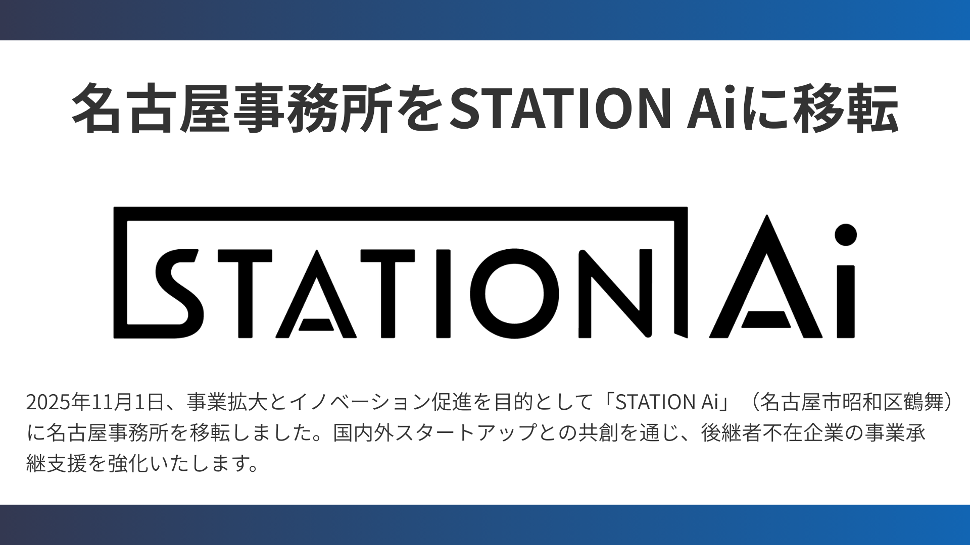 M&Aナビはこれまでも名古屋に拠点を置き、全国の金融機関・士業・M&A支援機関と連携しながら東海エリアの事業承継支援を行ってきました。さらなる現地プレゼンスの強化と、地域エコシステムとの連携深化を目的として、愛知県および民間が共同で運営する日本最大級のオープンイノベーション拠点「STATION Ai」への移転を決定しました。