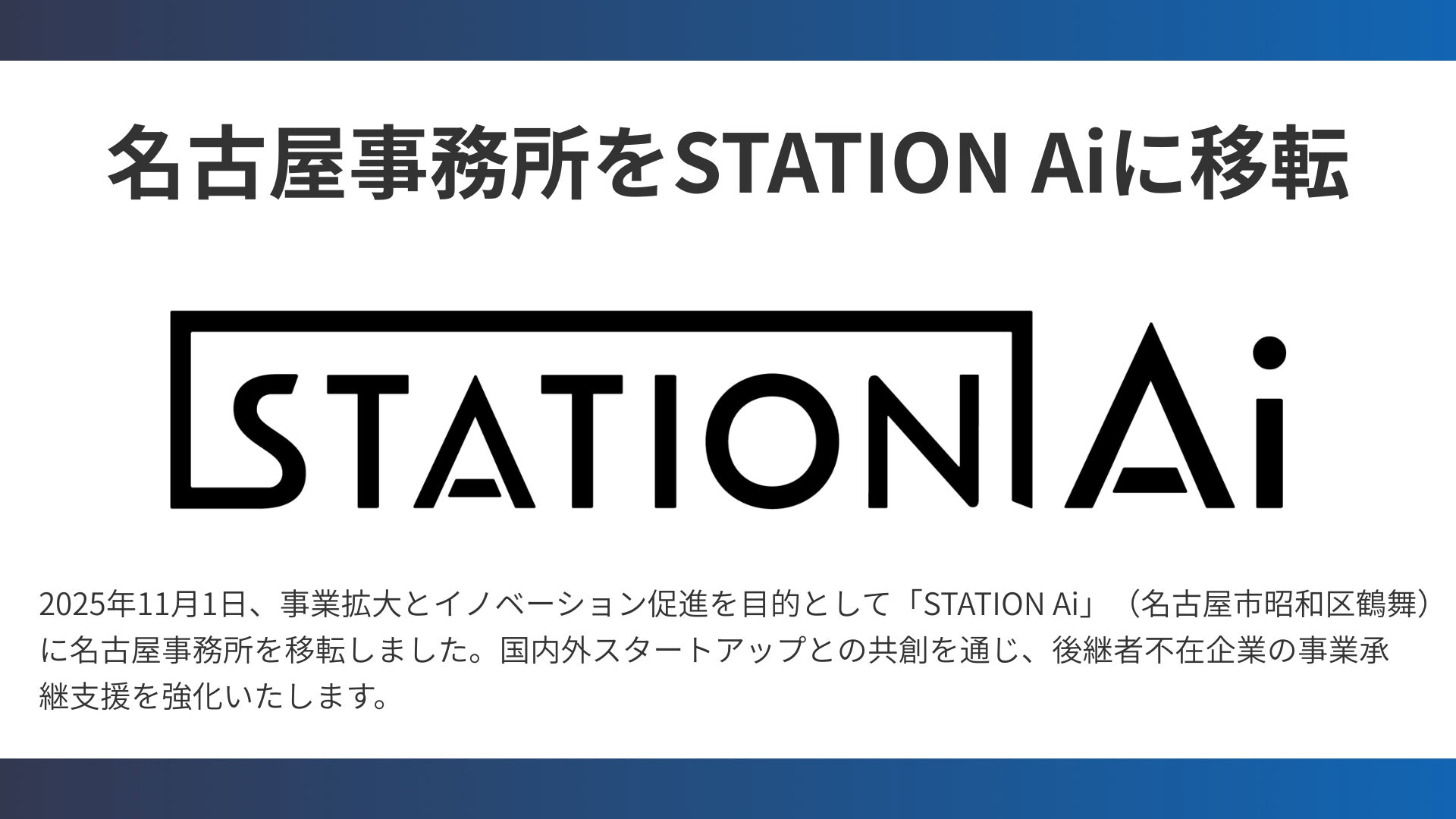 中小企業のM&Aをテクノロジーで支援するマッチングプラットフォームを運営する株式会社M&Aナビ(代表取締役社長:瀧田 雄介、本社:東京都品川区)は、2025年11月1日に名古屋オフィスを、愛知県が推進するオープンイノベーション拠点「STATION Ai」(名古屋市昭和区)へ移転しました。また、移転後5ヶ月で東海エリアにおけるM&A成約2件を達成しており、地域拠点の強化による事業拡大が着実に進んでいます。
