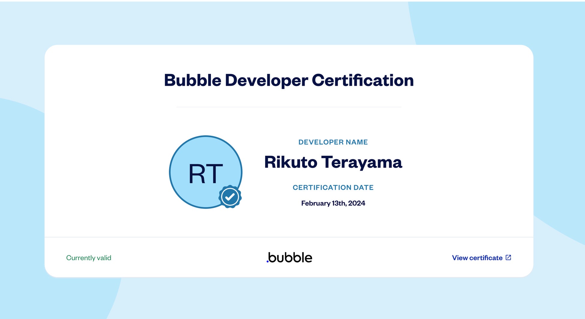 bubble公式認定資格は、ノーコード開発プラットフォーム「bubble」を用いて高品質なアプリケーションを開発できるスキルを持っていることを証明する公式資格です。