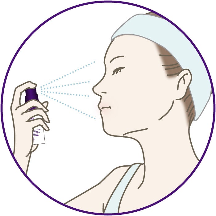 ご使用前にティッシュなどで軽く汗や皮脂を抑えたあと、顔から15cm程度離して4~5プッシュ噴きつけ、その後手のひらでやさしくハンドプレスします。