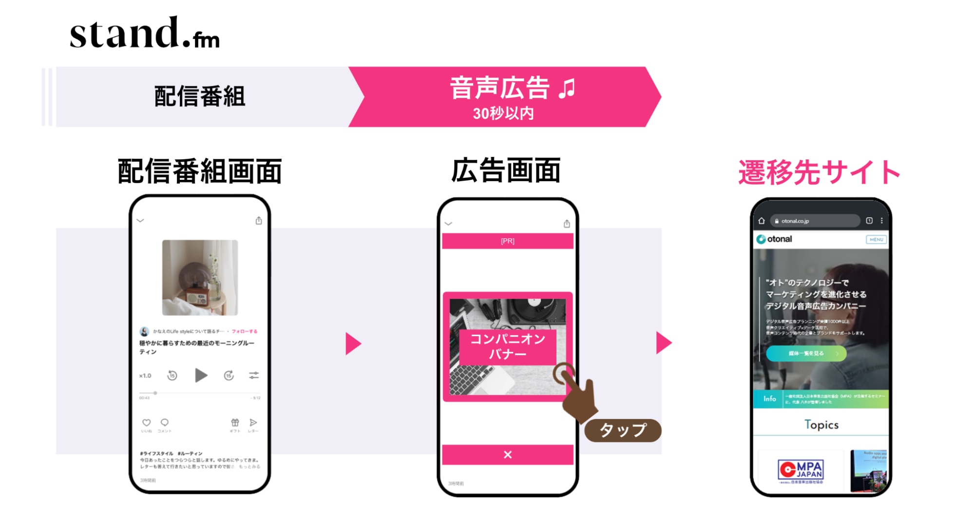番組コンテンツ間に、15秒、20秒、30秒の音声広告が配信されます。音声広告が再生されると同時に掲載されるコンパニオンバナーも表示されます。コンパニオンバナーをクリックすることで指定リンク先に遷移が可能です。