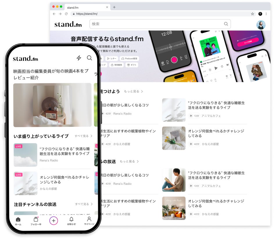 「stand.fm」は、stand.fm社が運営する音声配信アプリケーションです。「音声配信を気軽にもっと楽しく」をコンセプトに誰でも気軽に収録ができてすぐに配信でき、リスナーは人気のお笑い芸人からスポーツ選手まで、幅広い配信者のライブまたはオンデマンドの音声コンテンツをラジオ感覚で楽しむことができます。