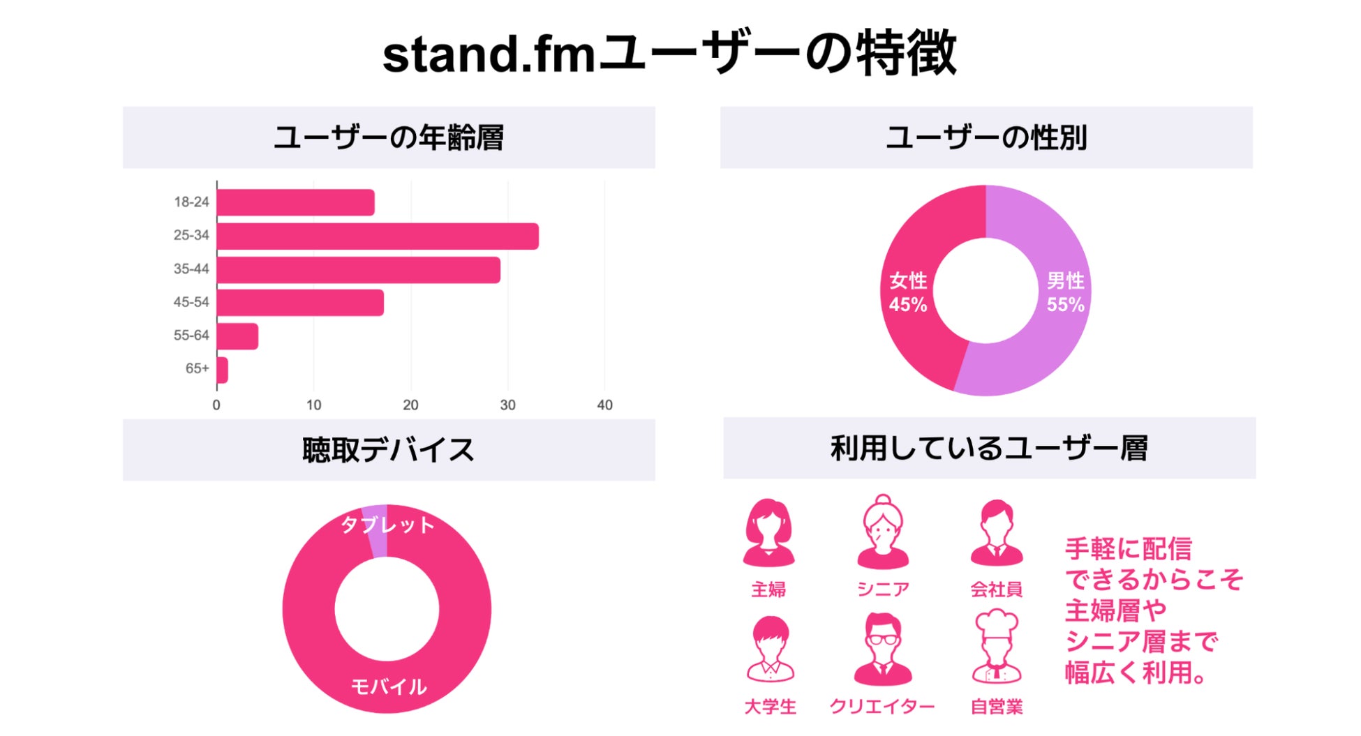 誰でも簡単に音声配信を行うことができるため、若年層はもちろんのこと、シニアや主婦層を含む、幅広い層のユーザーに使用されています。