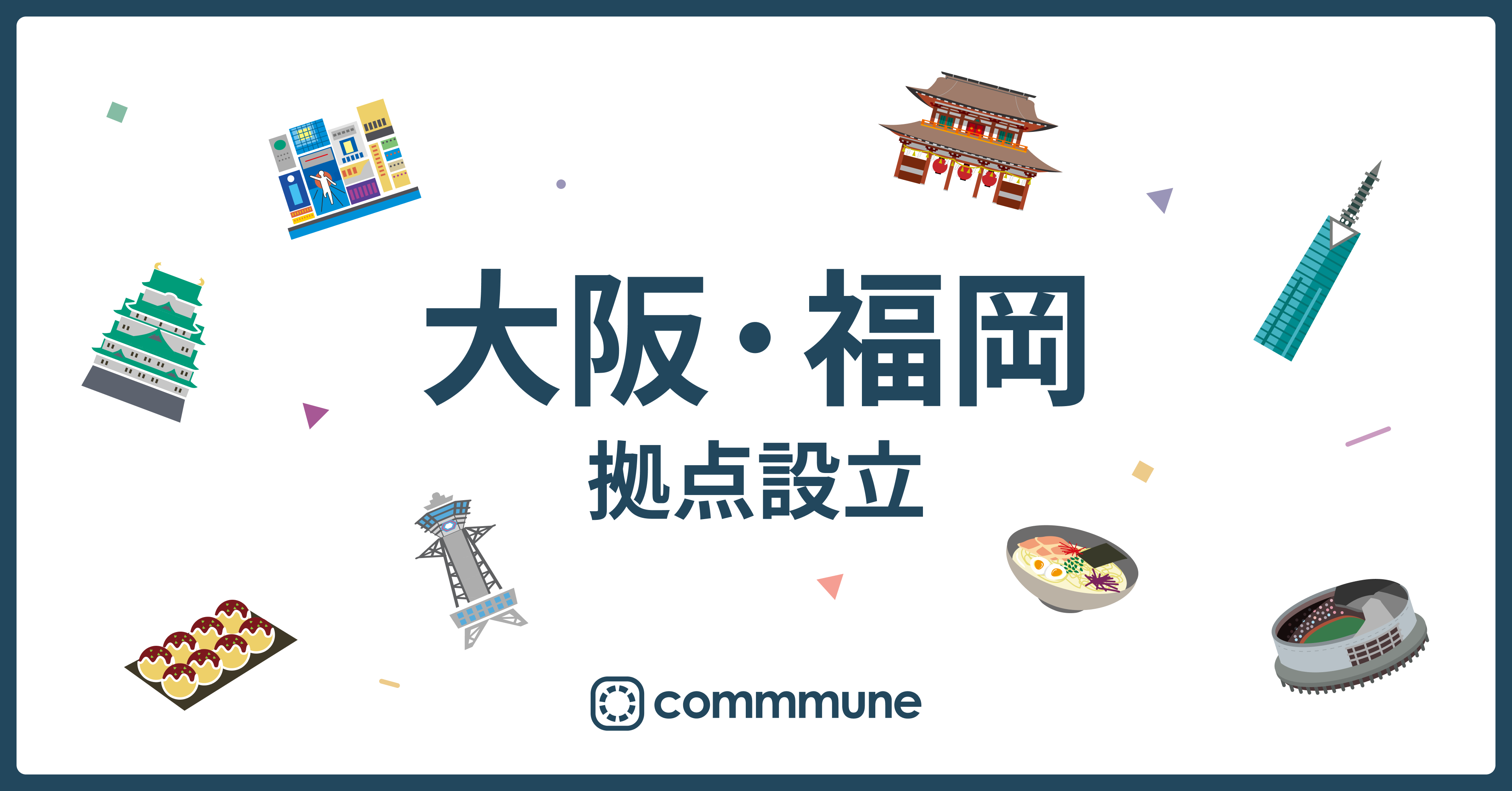 企業とユーザーが融け合うカスタマーサクセスプラットフォーム「commmune(コミューン)」と効率的なカスタマーサクセスのためのアクション基盤「SuccessHub(サクセスハブ)」を提供するコミューン株式会社(本社:東京都品川区、代表取締役CEO:高田優哉)は、大阪拠点と福岡拠点を設立したことをお知らせいたします。