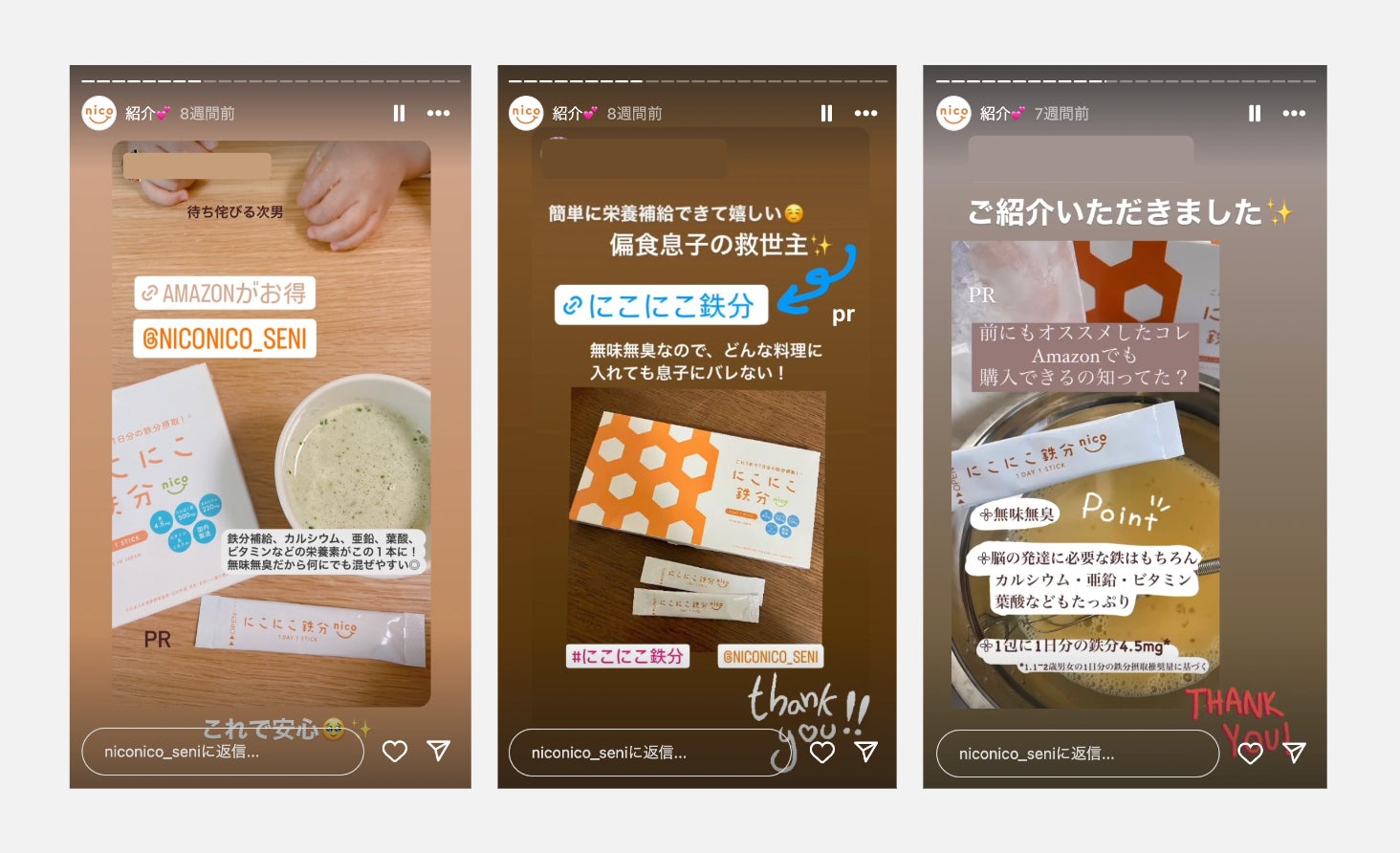 子供向け健康食品で実施した際は月間10~15名ほどのインフルエンサーの投稿により、スタート月である11月より300%以上の売上アップの成果をだしております。