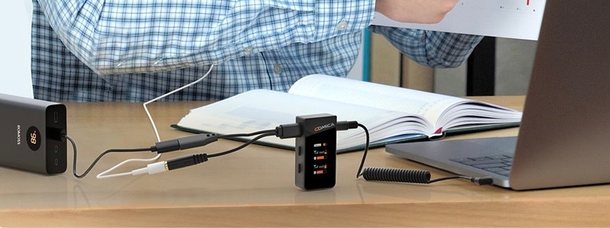 また、長時間の使用とリアルタイムでのモニタリングの両立が実現。2in1のプラグをつなぐことで受信機の充電をしながらモニタリングをすることが可能です。そのため、長時間の会議やライブ配信でも充電の切れる心配がなくご使用いただけます。