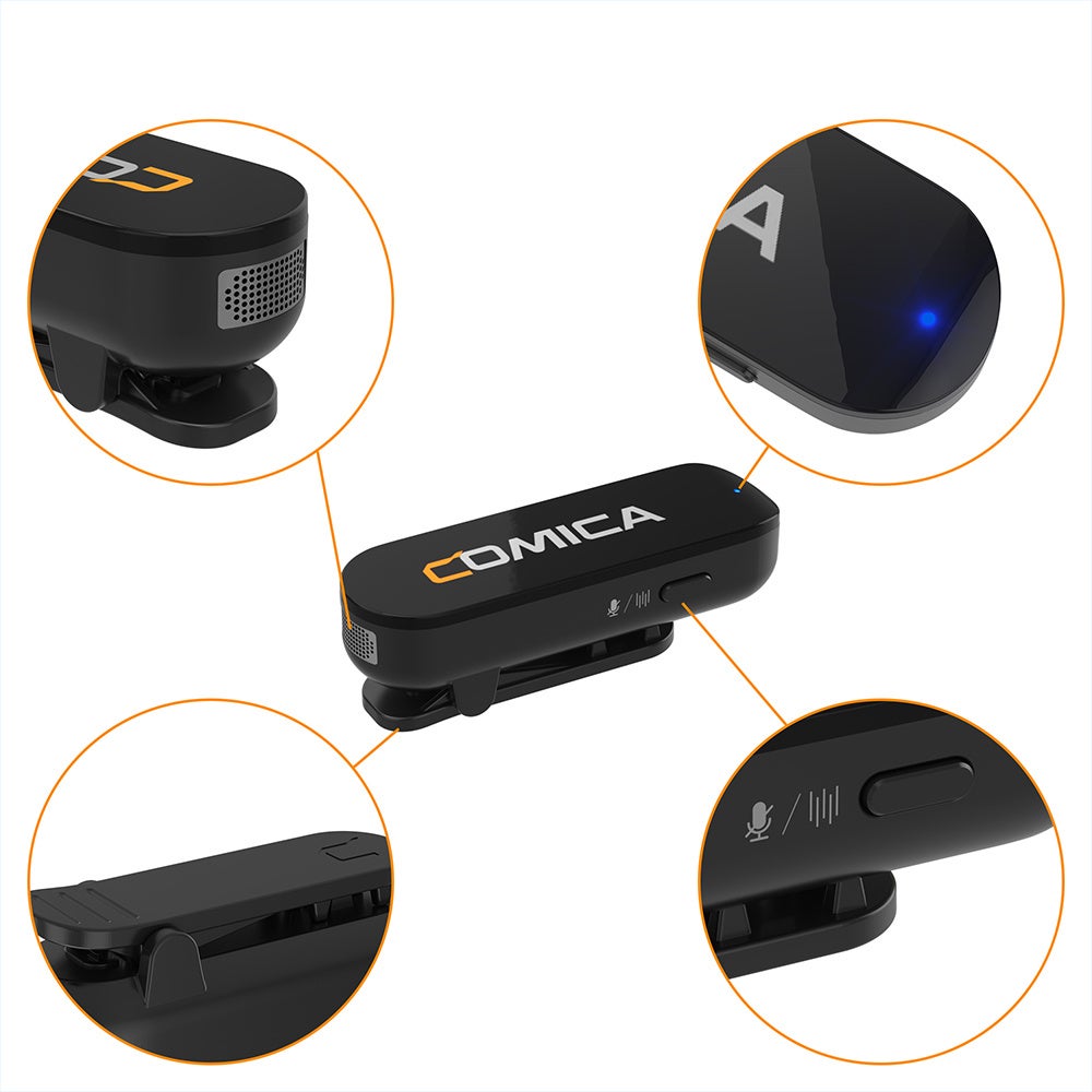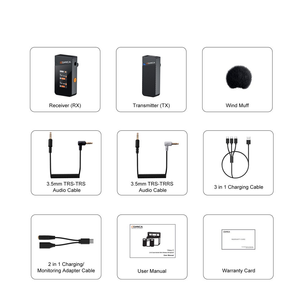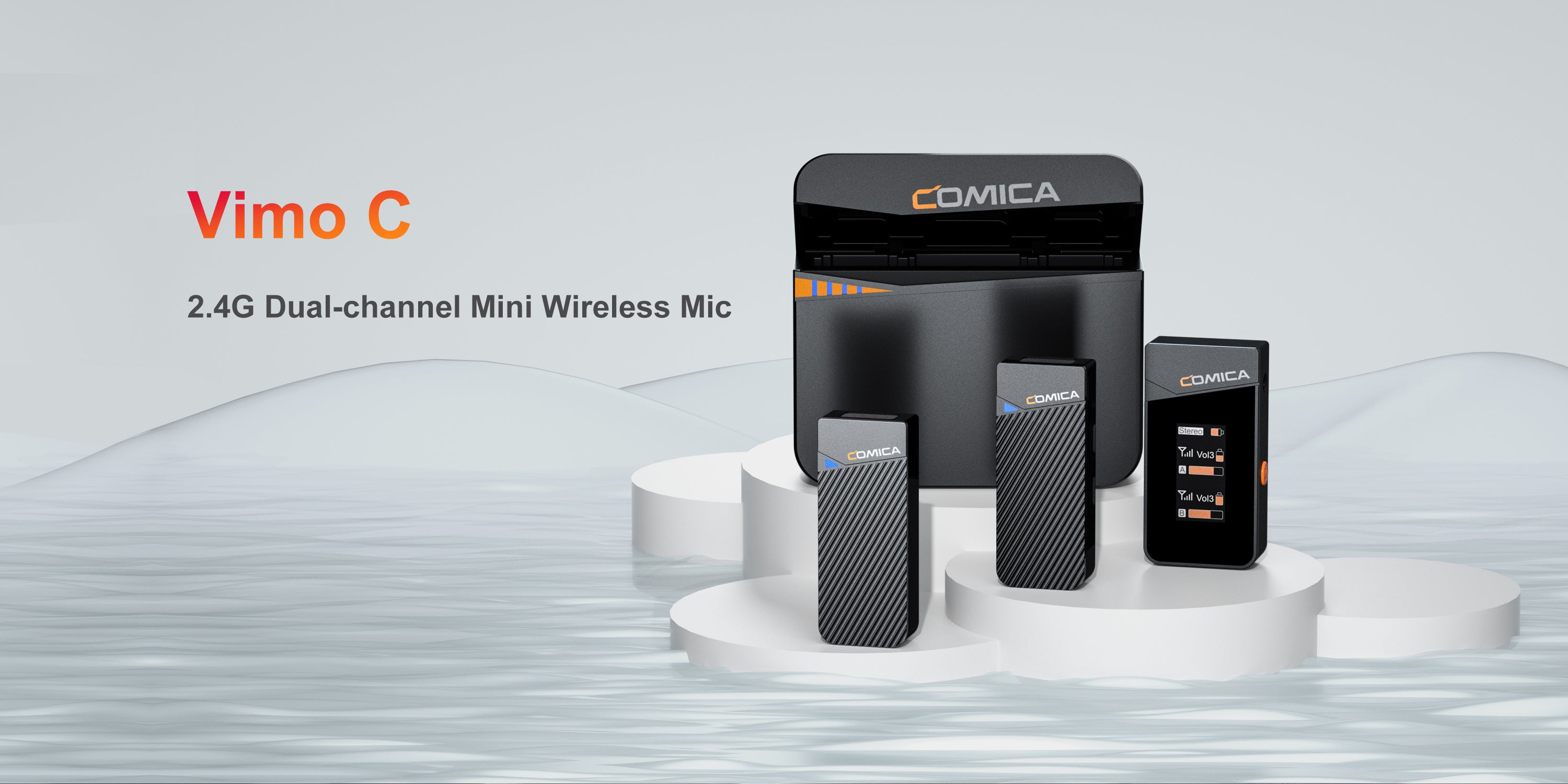 COMICA Vimo Cは、2.4GHzのデュアルチャンネルミニワイヤレスマイクです。カメラ、スマートフォン、PCで使用することができます。48khz/24bitサンプリングレートの高音質を実現。ケースから取り出すだけで自動にペアリングされ、簡単にご使用いただける仕様となっています。