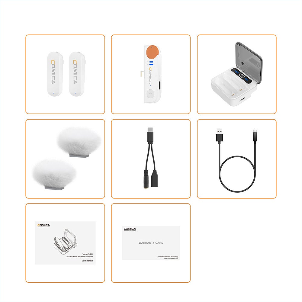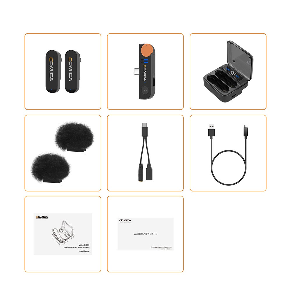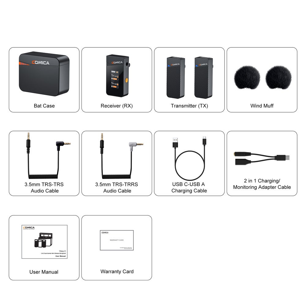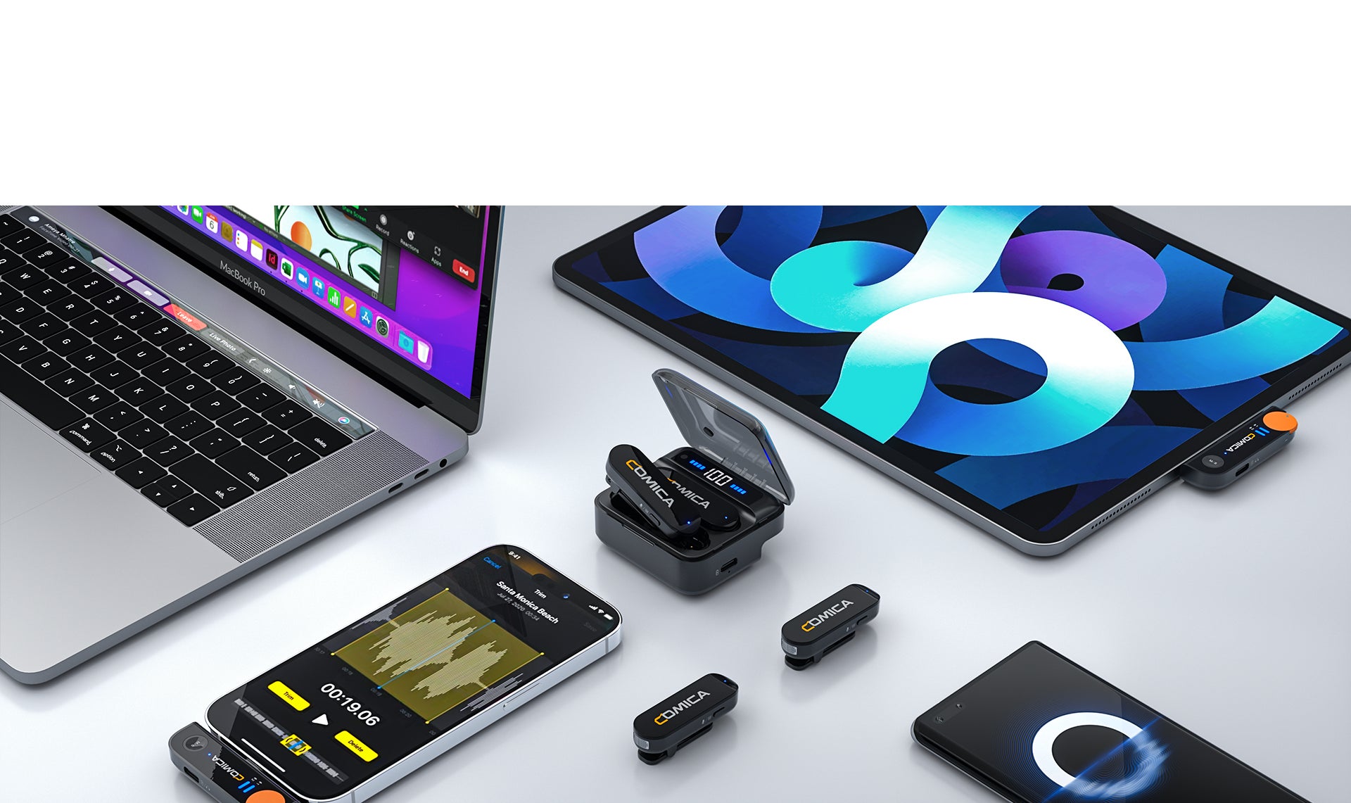 COMICA Vimo Cは、2.4GHzのデュアルチャンネルミニワイヤレスマイクです。カメラ、スマートフォン、PCで使用することができます。48khz/24bitサンプリングレートの高音質を実現。ケースから取り出すだけで自動にペアリングされ、簡単にご使用いただける仕様となっています。