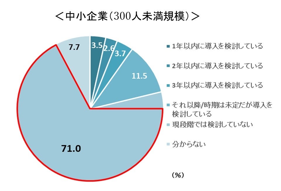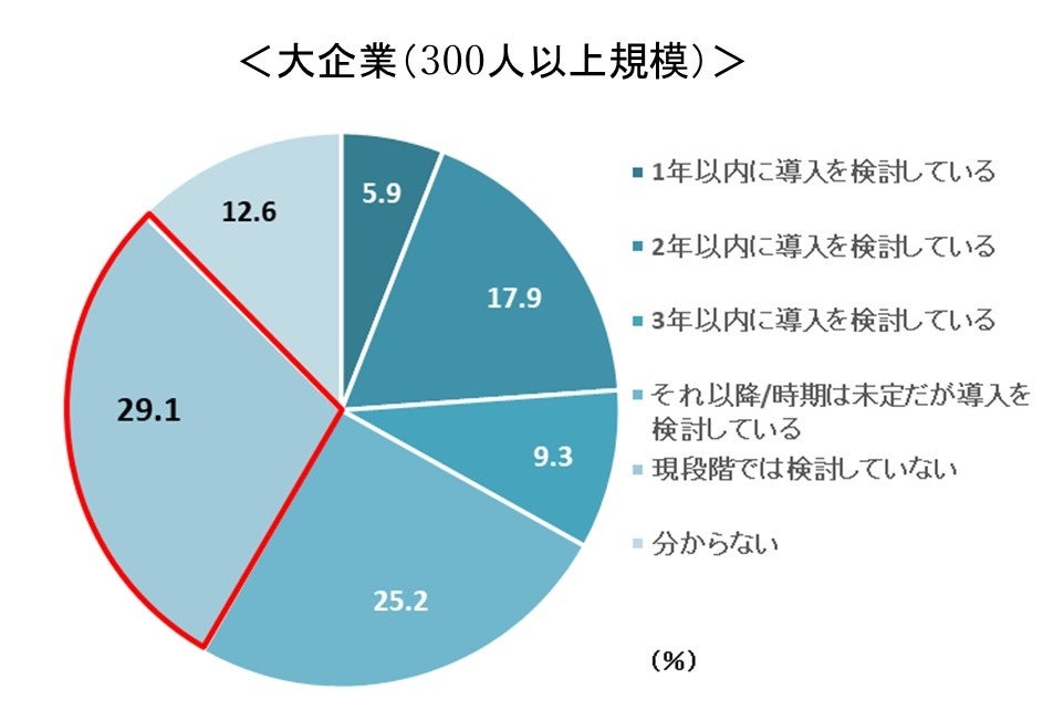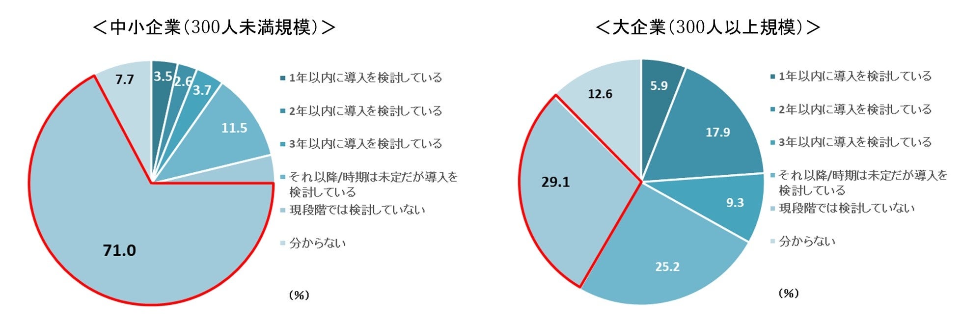 ▶ AI未導入の企業の中で、AIの検討状況に中小企業(300人未満規模)と大企業(300人以上規模)で格差あり。