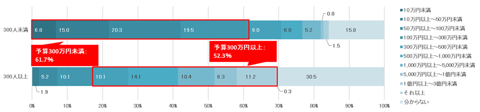 中小企業がAI導入にかけている年間予算は300万円以下が6割に対し、大企業は300万円以上が半数以上という結果に