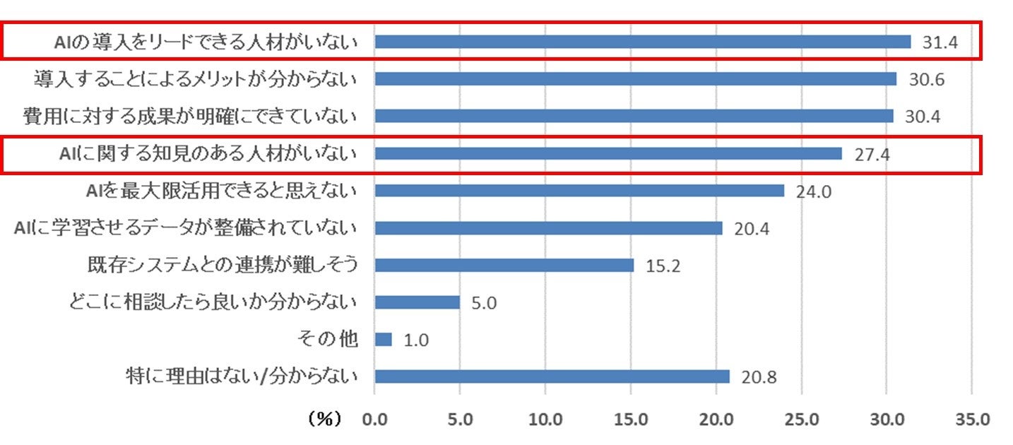 また、AIを導入していない企業が導入していない要因としても人材不足が挙げられ、