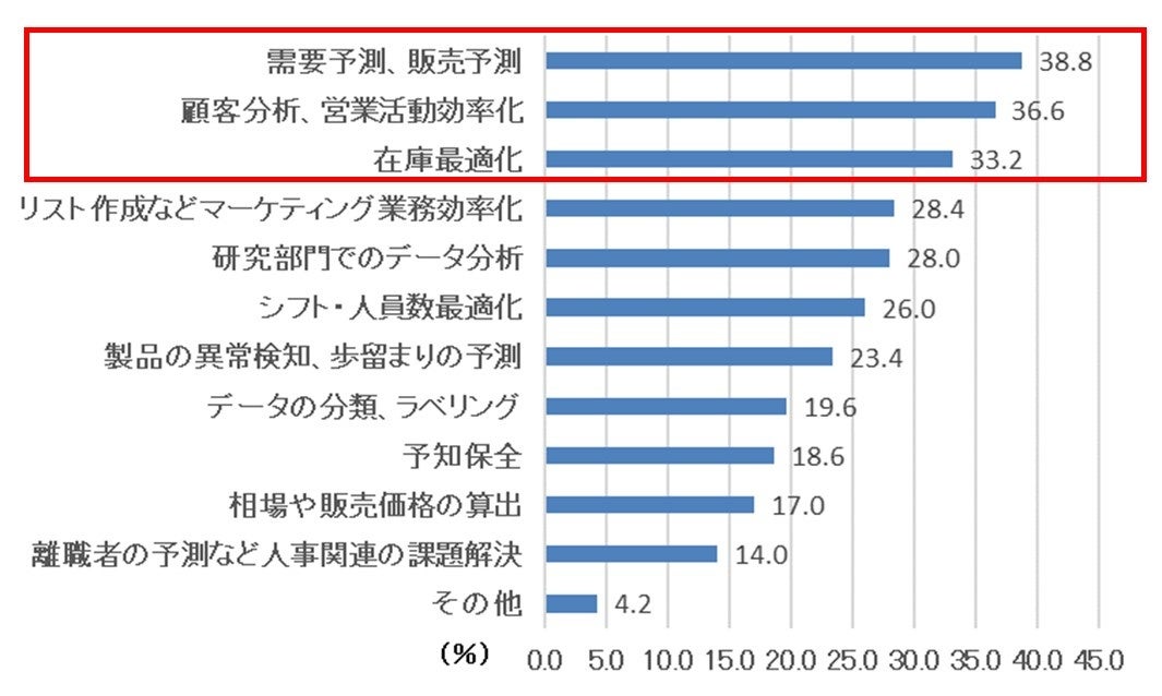 また、「AIの用途(図2)」については1位「需要予測、販売予測」(38.8%)、2位「顧客分析、営業活動効率化」(36.6%)、3位「在庫最適化」(33.2%)となり、主に効率的な需給管理に使用されていることがうかがえます。