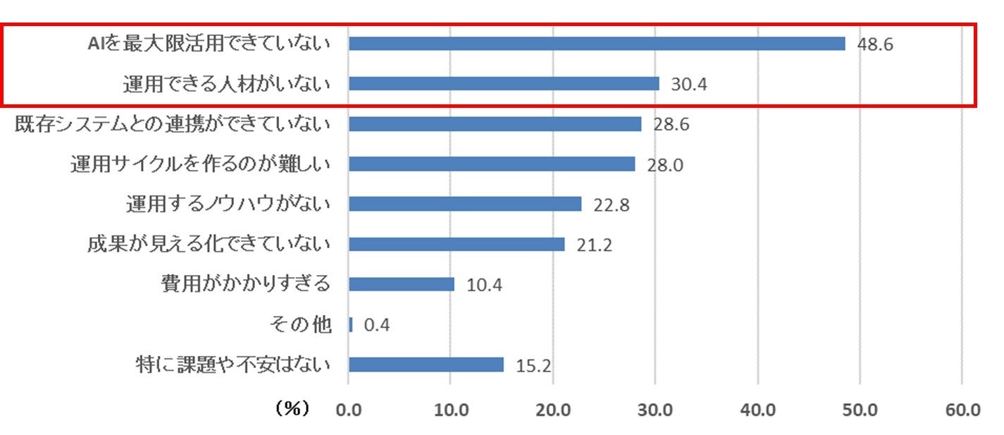 ▶ AIを導入している企業の課題は、効率的な運用ができていないことと人材不足。