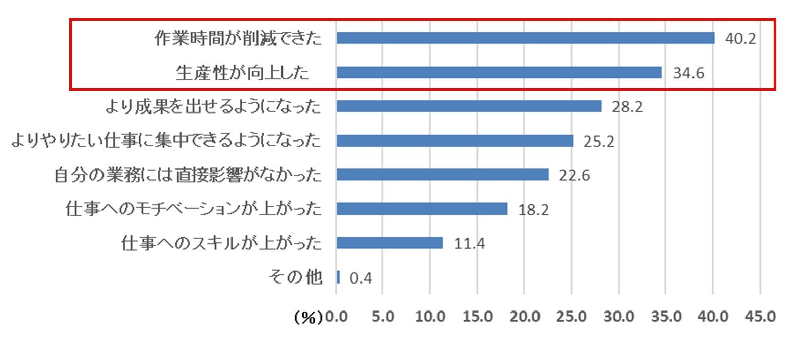 - AI導入により、4割以上の人が、業務の作業時間を削減できたと感じている一方で、大幅な作業時間の削減は今後の挑戦。