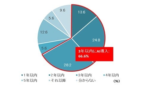 - AI導入企業の3社に2社が2019年の新型コロナウイルス蔓延開始時期前後である3年以内にAIを導入。