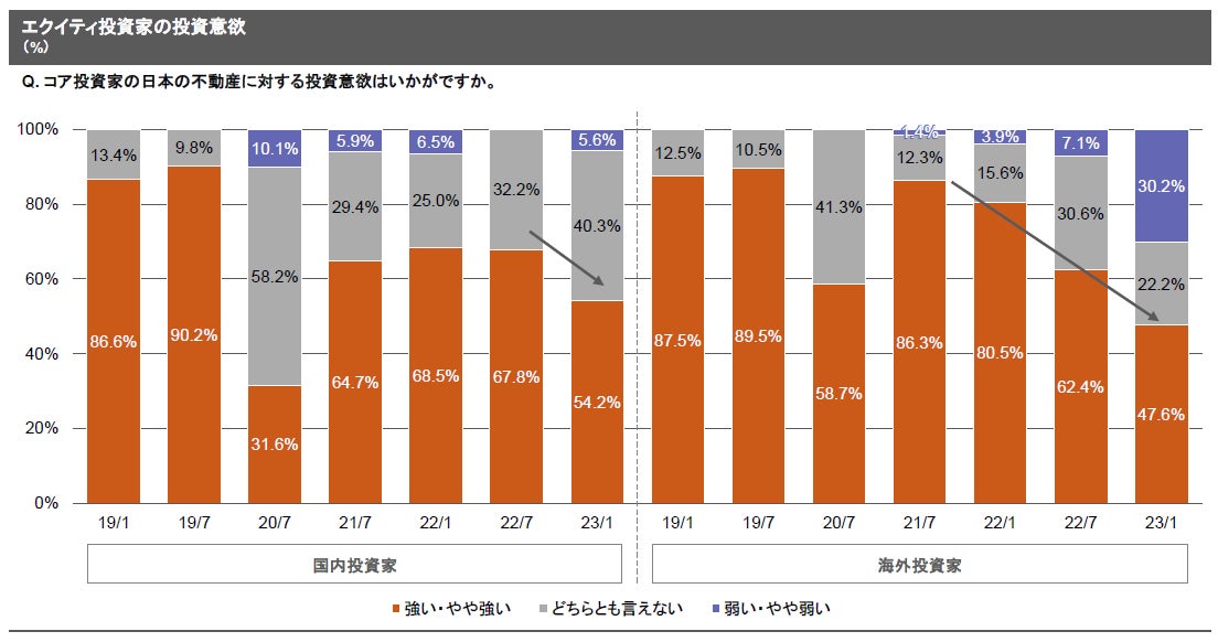 - エクイティ投資家の投資意欲は、国内投資家・海外投資家ともに「強い・やや強い」のポジティブな回答の割合が低下している。イールドギャップが高水準であること等から、引き続き半数程度の投資家はポジティブな回答となっているものの、海外投資家においては、慎重な姿勢が強まっているようだ。