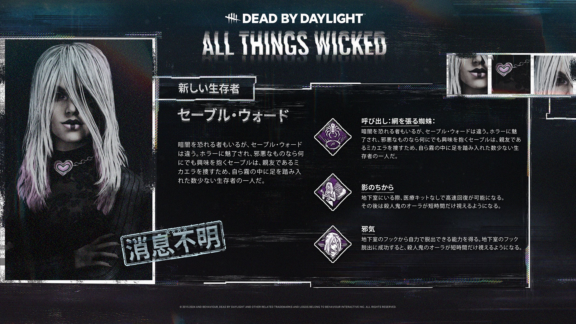 カナダ最大手のゲーム開発・販売会社であるBehaviour Interactive Inc.は、非対称対戦型マルチプレイヤーホラーゲーム『Dead by Daylight(デッド・バイ・デイライト)』にて、最新オリジナルチャプター「All Things Wicked(あらゆる悪しきもの)」を2024年3月13日(水)より発売いたします。