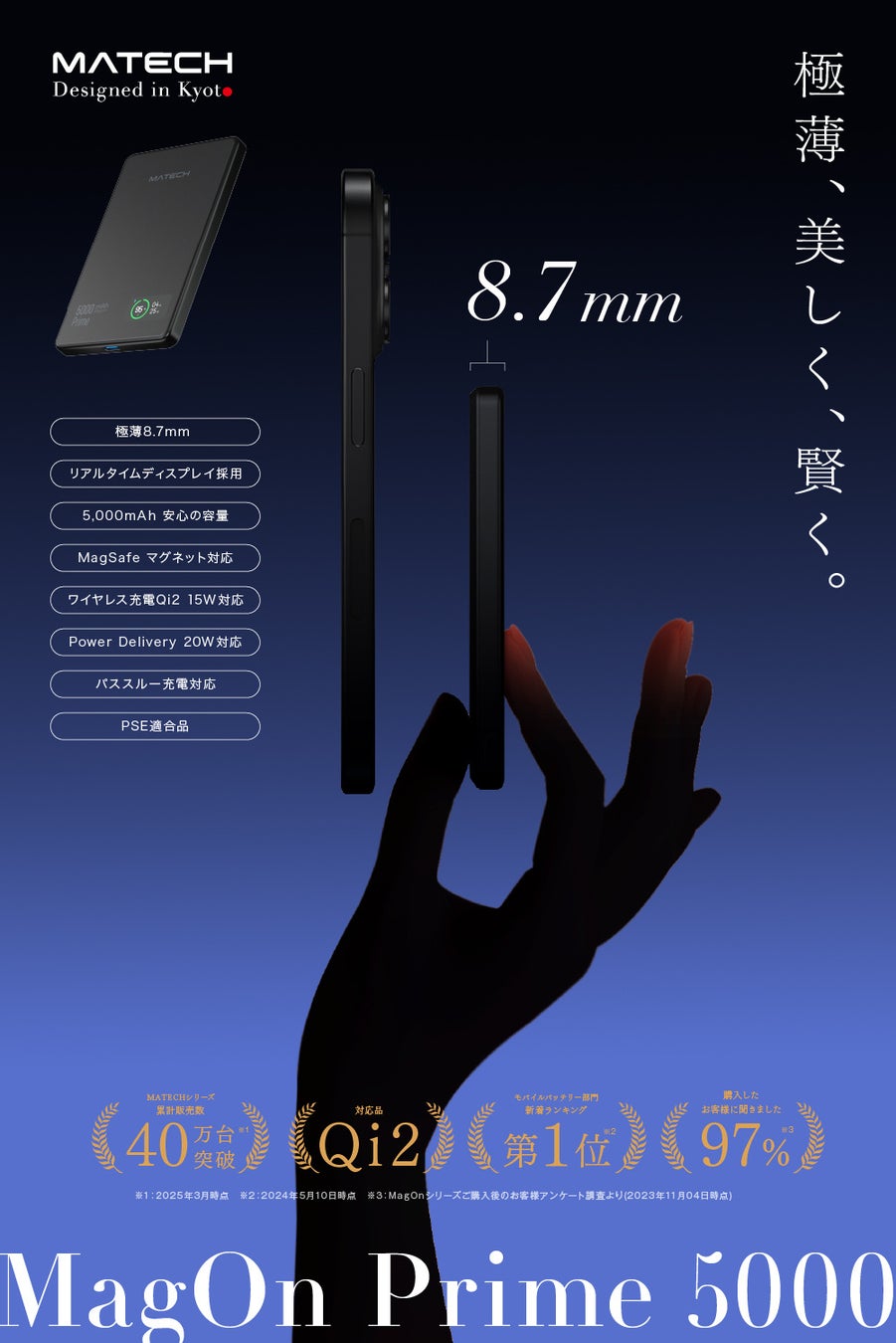 モバイルバッテリーや充電器など、デジタルガジェットを手がけるMATECH株式会社(本社:京都市下京区)は、Qi2対応の超薄型モバイルバッテリー「MagOn Prime 5000」を新たにAmazon.co.jpにて発売開始しました。