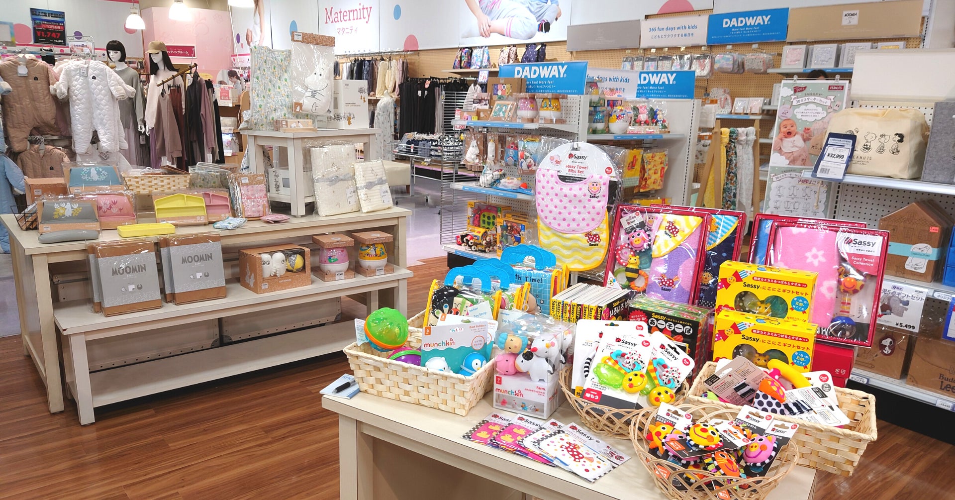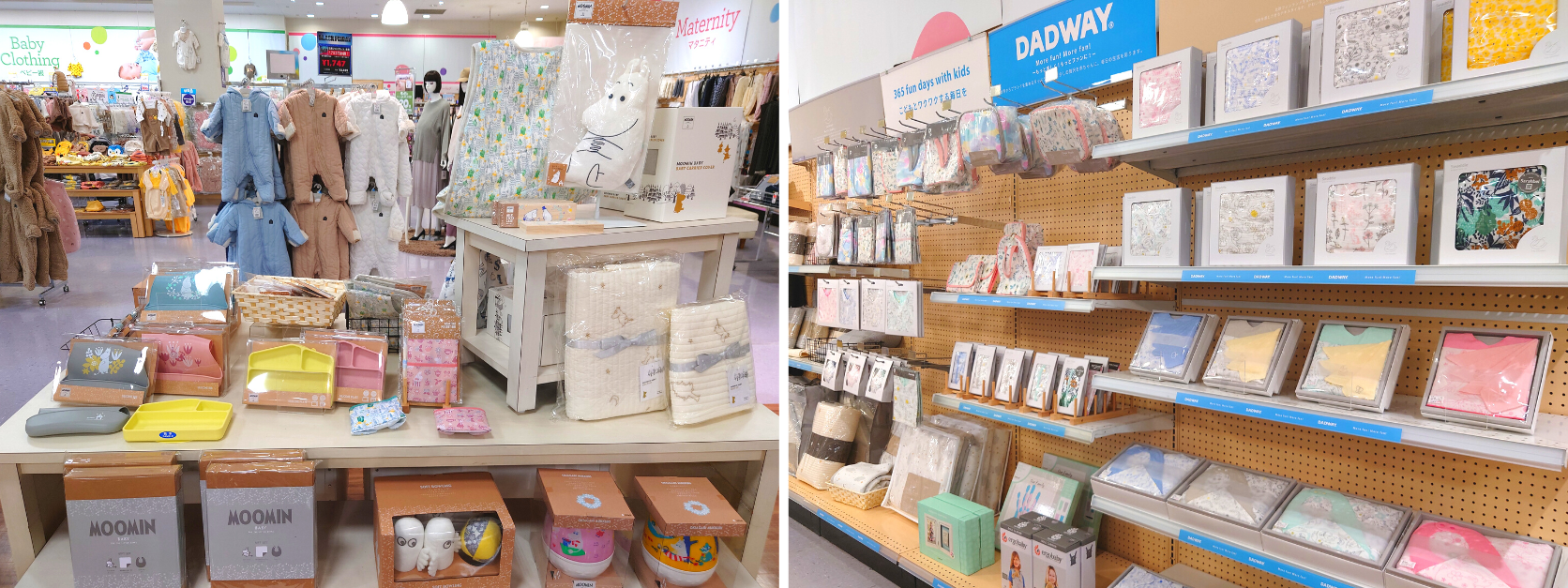 世界中の育児用品を紹介する DADWAYから生まれた「D by DADWAY(ディーバイダッドウェイ)」やフィンランド生まれのキャラクター「MOOMIN」のベビーブランド「MOOMIN BABY(ムーミンベビー)」など、日本の子育て事情やトレンドに着目した自社開発商品を中心にラインナップ。