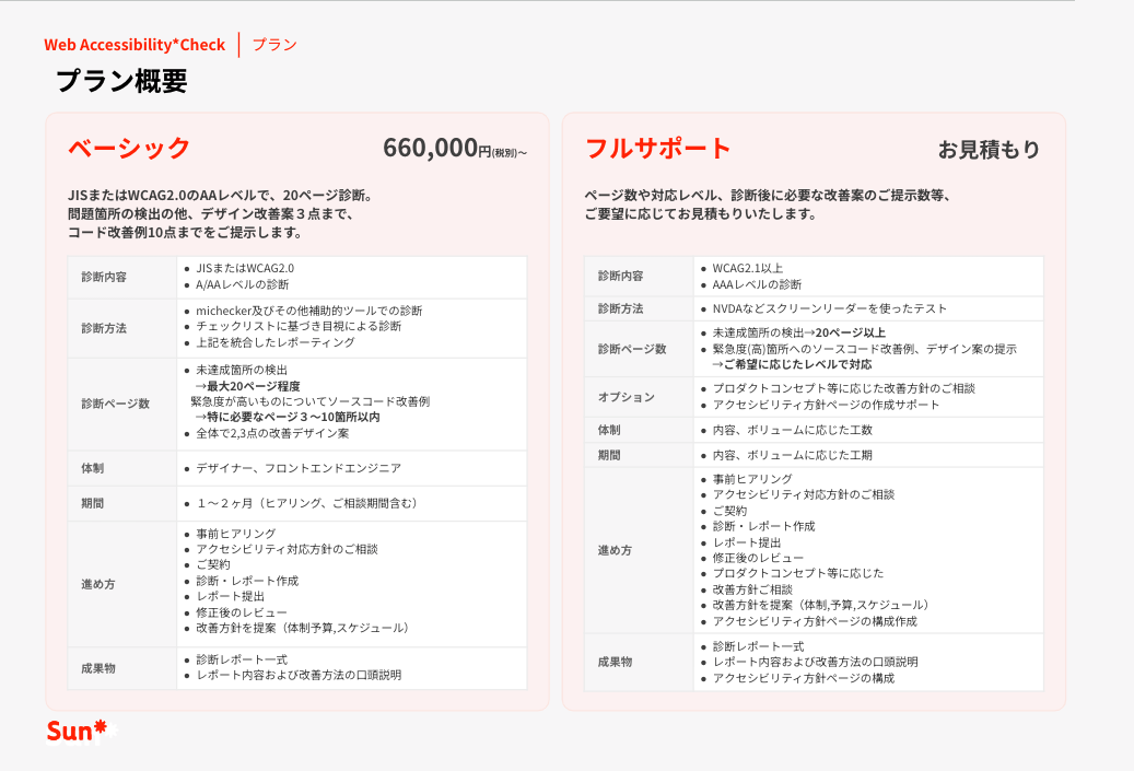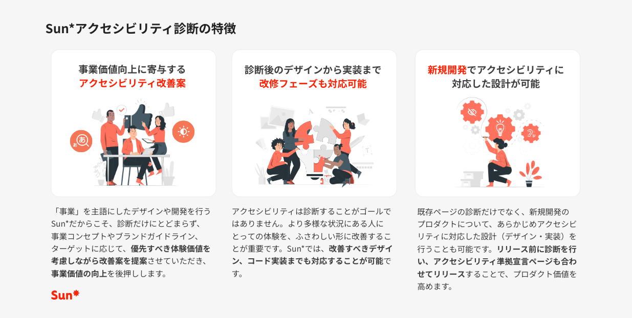 Sun*は、これまで500社850以上の事業開発に携わり、サービスデザインからUI/UXデザイン、プロダクト開発・構築・運用支援をしてきました。本サービスでは、これまでの実績とノウハウを活かし、Webサイト・Webアプリケーションを診断し、ウェブアクセシビリティの改善提案をおこないます。