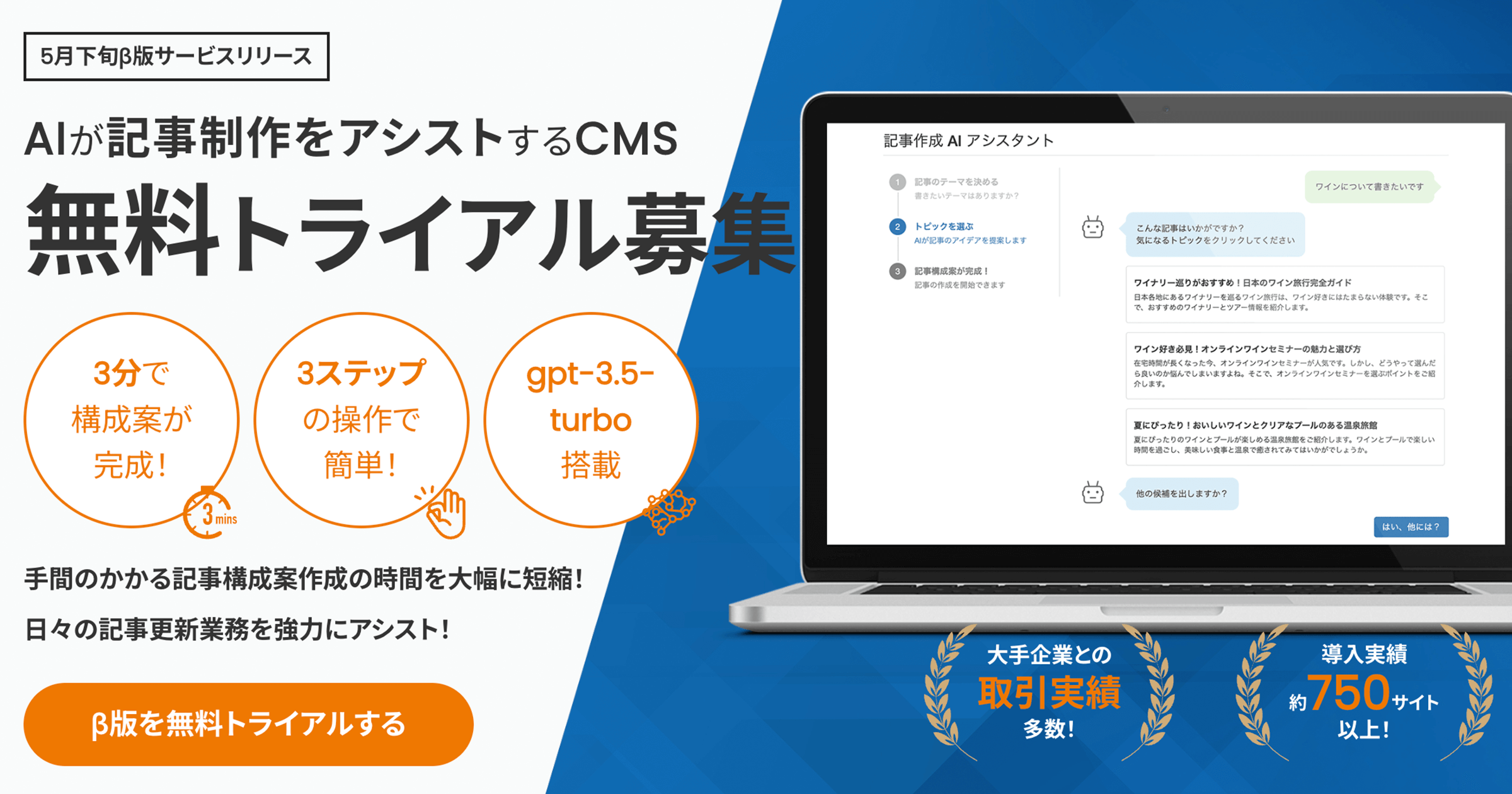 今回、新たに開発した新機能「記事作成AIアシスタント」では、記事のテーマ決めから構成案作成までを3ステップで完結し、記事制作をスピーディーに行うことが可能です。