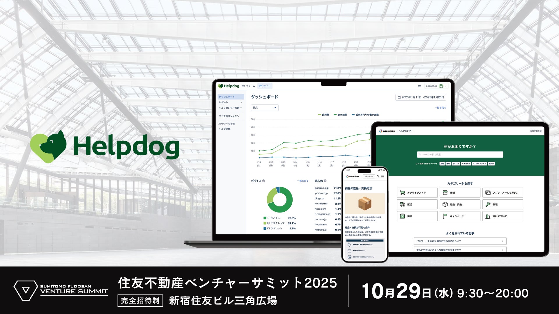 noco株式会社(本社:東京都中央区、代表取締役:堀辺 憲)は、セルフサポートシステム「ヘルプドッグ」を、2025年10月29日(水)に新宿住友ビル三角広場(東京都新宿区)で開催される「住友不動産ベンチャーサミット2025」(主催:住友不動産株式会社)に出展いたします。本イベントは、スタートアップを中心としたビジネスマッチング型の完全招待制イベントであり、事業会社とスタートアップの共創を通じて、新たな事業創出と成長の機会を提供します。