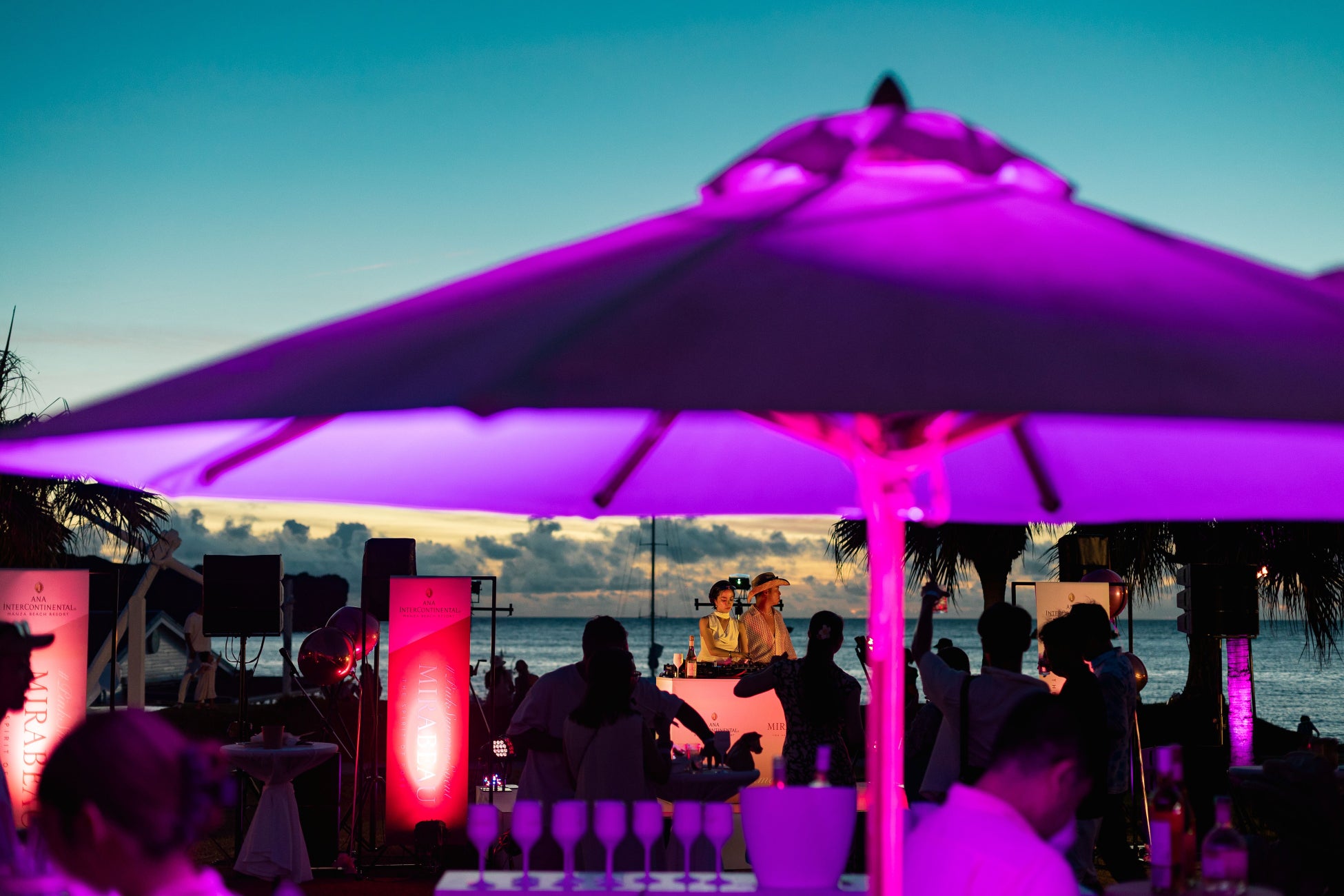 ピンクと白をテーマにした本イベントは、美しい珊瑚礁とエメラルドブルーに輝く万座ビーチで開催され、テーマカラーを身につけた参加者の皆様は爽やかでエレガントなメゾン・ミラボーのロゼワインを片手に、音楽や夕陽に酔いしれました。ライブパフォーマンスには、沖縄県内で人気のDJ KIORAさんや、国内外のファッションパーティーなどでも活躍するDJ UNA+MATCHA さん等も登場し会場をさらに盛り上げました。そして、2日間のイベントフィナーレには、美しい夜空にピンクを基調とした華麗な花火が上がり、さらに皆様の心に刻まれる夏のイベントとして幕をとじました。