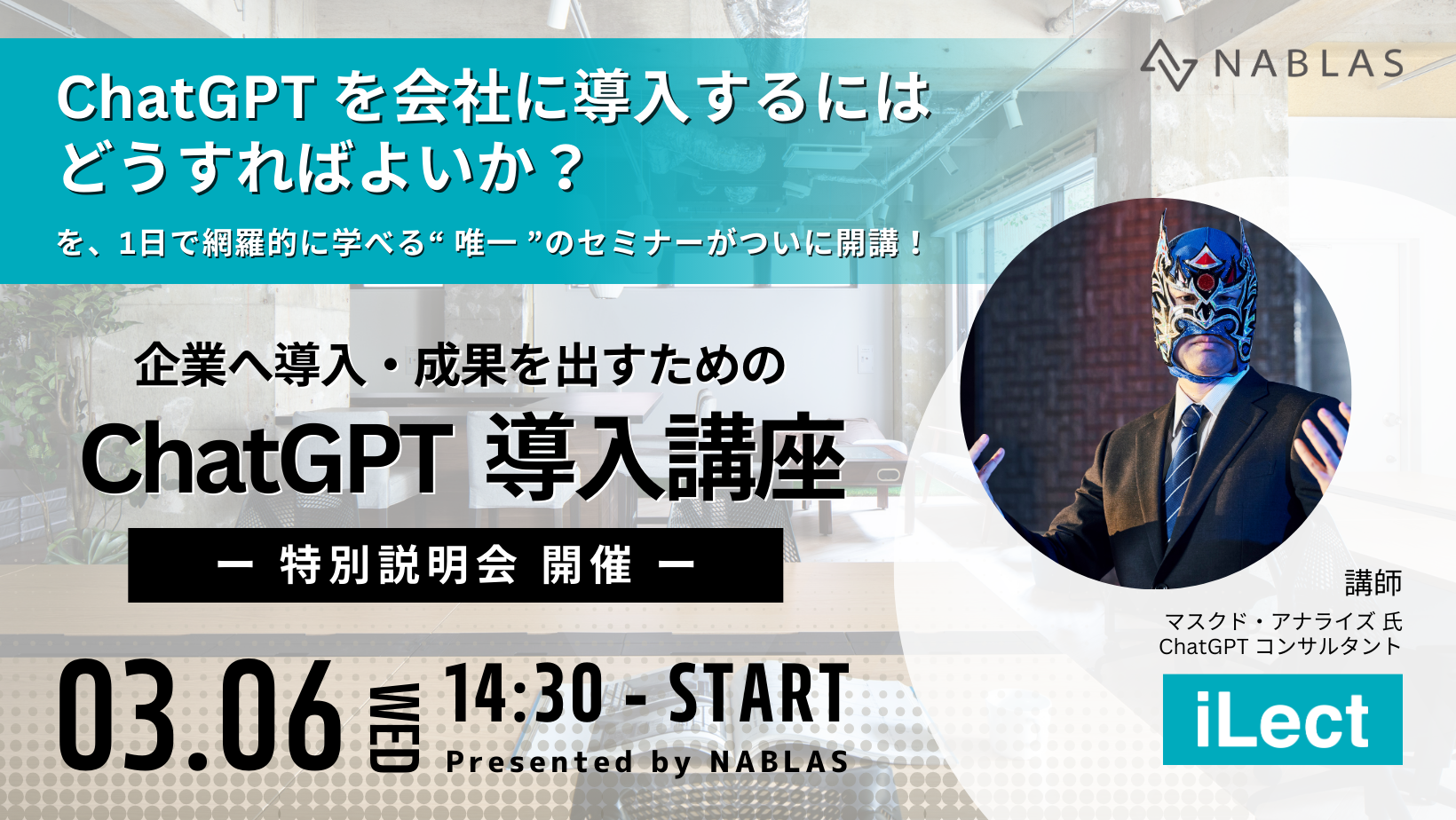 この講座は ChatGPT コンサルタントである、マスクド・アナライズ氏を講師として迎え、ChatGPT を仕事で活用する方法や、導入に必要なチームの立ち上げ方法などをのスキルを、座学+グループワーク(計4時間)で習得を目指す、特別集中プログラムです。
