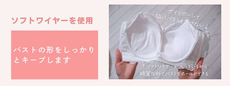 PGブラは、女性医師が監修し使用しても安心なソフトワイヤーを採用しています。従来のワイヤーブラのように、胸に食い込んだり痛みを感じたりすることがありません。