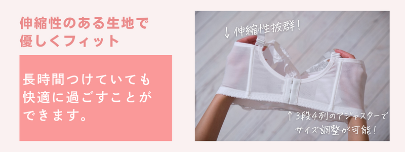 PGブラは、伸縮性のある生地を使用することで、胸に優しくフィットします。また、肌に触れる部分は、 肌に優しい素材を使用しているため、長時間つけていても快適に過ごすことができます。