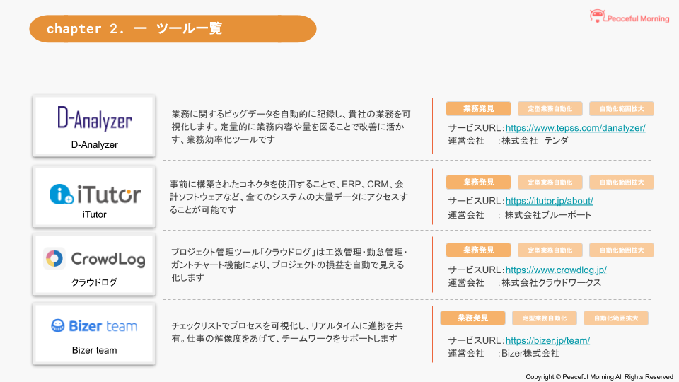 Peaceful Morningは、『我慢しないで働ける社会を創る』というミッションのもと、業務自動化テクノロジーを通じて、我慢せず⾃由にクリエイティブな仕事ができる社会の実現を⽬指しています。2018年の創業からRPAに関する専門メディア「RPA HACK」、RPA開発者育成サービス「Robo Runner」、国内最大級の約1,000名が登録するRPA・ローコードプロフェッショナルマッチングプラットフォーム「RPAプロフェッショナル」等、自動化・デジタルトランスフォーメーション(DX)を前に進める事業を行っております。