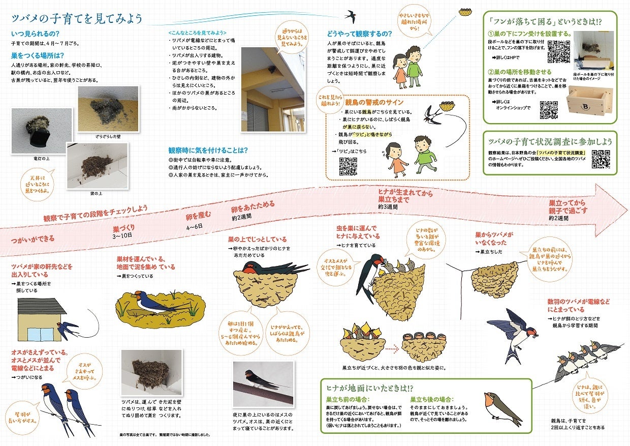 ツバメの基礎知識や観察の方法、観察時の注意点などを一枚のパンフレットにまとめました。また、ツバメの子育てのプロセスや見どころをイラストで解説しています。