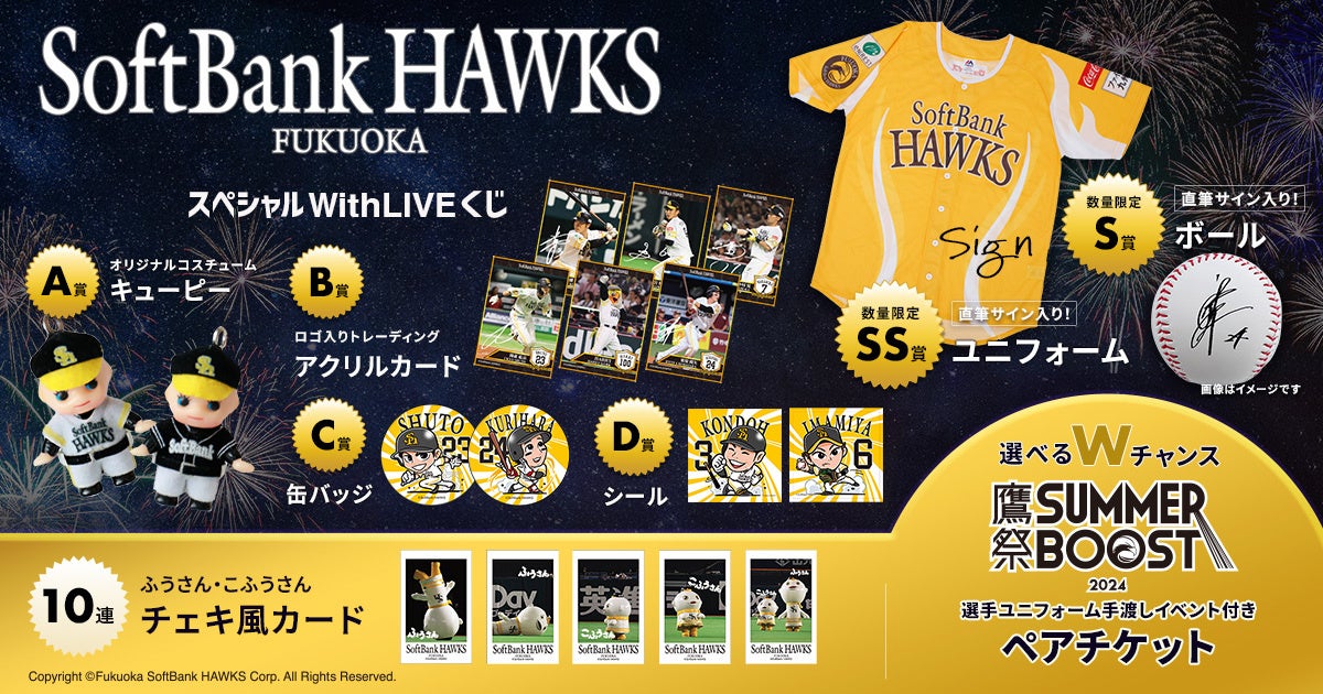 本契約の締結に伴い、当社にて運営するオンラインくじサービス「WithLIVEくじ」にて、『福岡ソフトバンクホークス スペシャルWithLIVEくじ』を開催いたします。本くじでは、「所属選手のサイン入りユニフォーム」のほか、「オリジナルコスチュームキューピー」、描き下ろし選手アートを使用した「オリジナルステッカー」など、ここでしか手に入らない限定景品をご用意しました。またWチャンス賞として、くじ10回分を1回で購入できる10連くじ購入者の中から、2024年8月2日と4日に行われる「鷹祭 SUMMER BOOST」のペアチケット(ユニフォーム選手手渡しイベント参加券付き)抽選で22名様(22ペア)が当たります。ぜひこの機会にご参加ください。