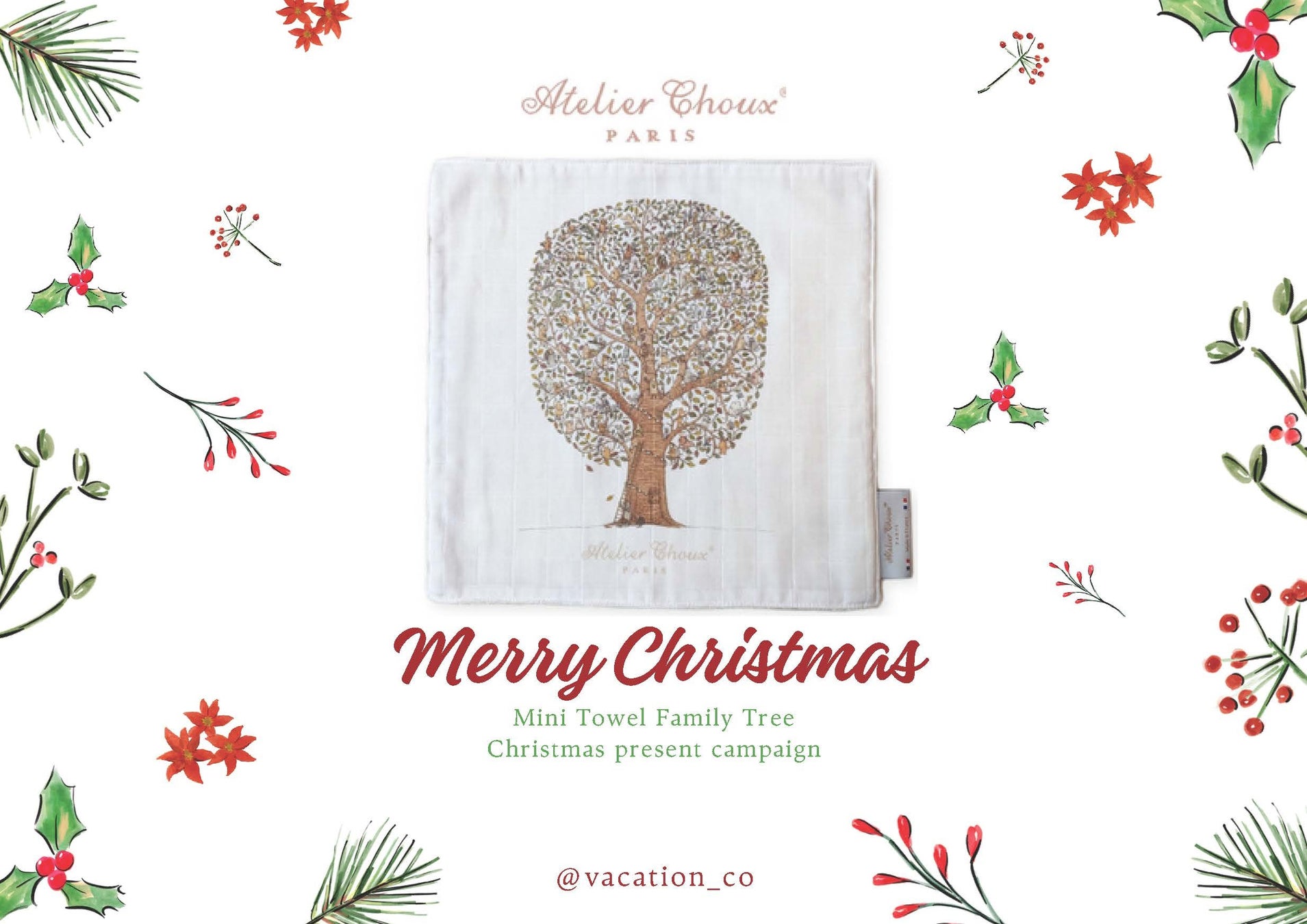 おしゃれで「これ、 いいね!」と思っていただけるベビーアイテムをセレクトしてWEBと実店舗で販売する株式会社バケーション(所在地:群馬県前橋市、 代表取締役:松原初美)は、 フランス直輸入の「AtelierChoux/アトリエシュウ」”ミニタオル” クリスマスプレゼントキャンペーンを開催。